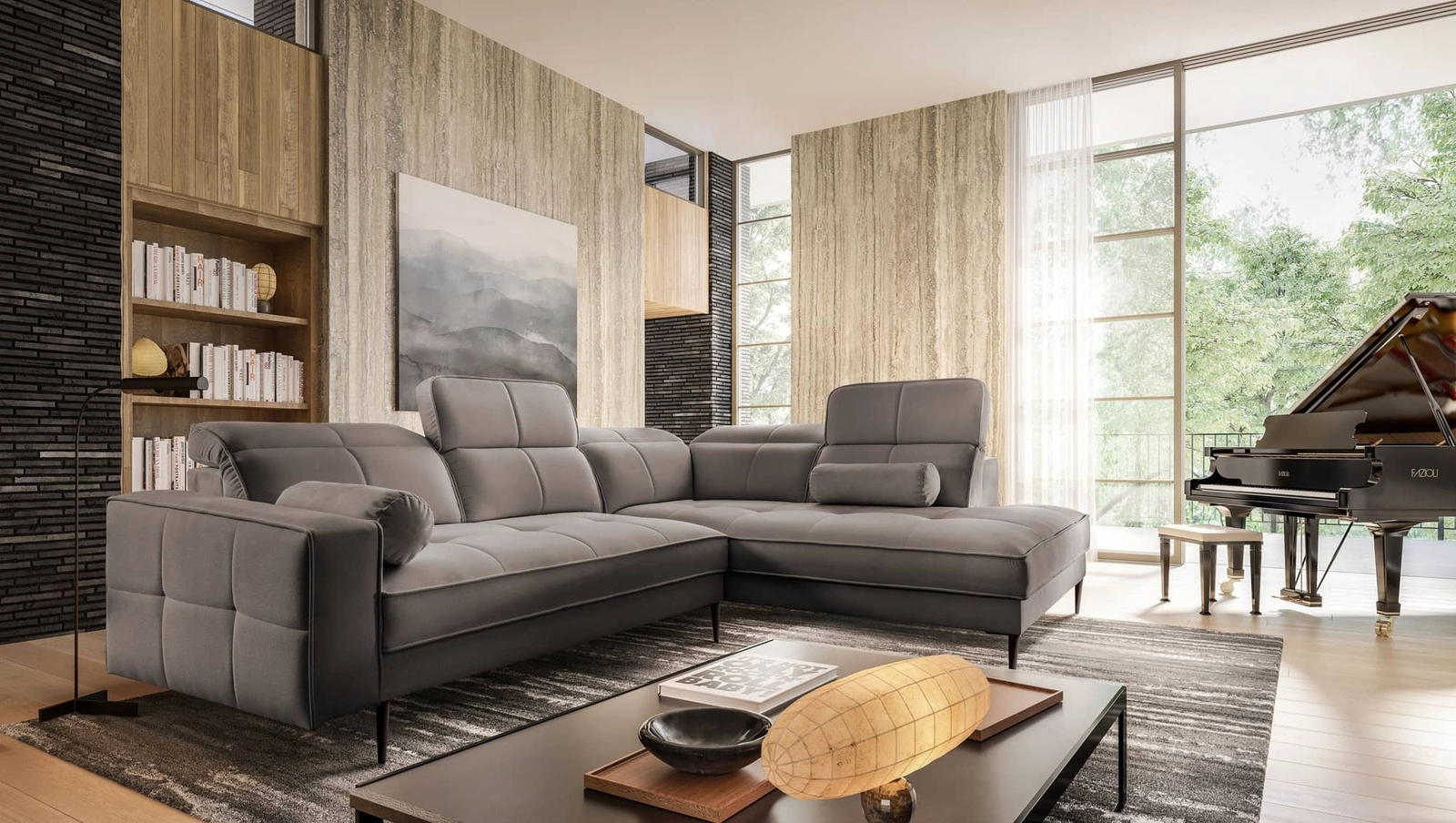 Narożnik Samos szary prawostronny nowoczesny design prosta i stylowa bryła wpisująca się w każdą aranżację regulowane zagłówki