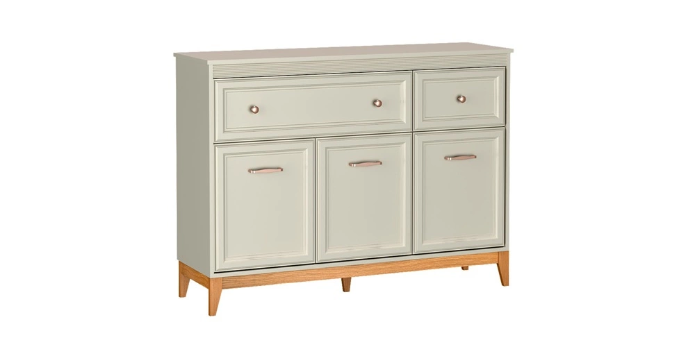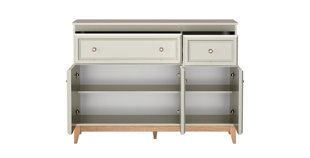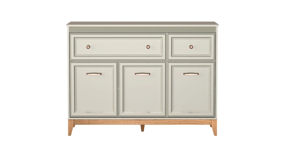 Delikatne frezowania i ozdobne listwy wykonane z płyty MDF nadają komodzie wyjątkowego uroku. Stabilne nogi z litego dębowego drewna gwarantują trwałość i naturalne piękno. Stylowe, metalowe uchwyty to elegancki detal, który idealnie współgra z ciepłym kolorem korpusu. Komoda do salonu wyposażona jest w system cichego domykania drzwi i szuflad. Zastosowany system zwiększa komfort codziennego użytkowania.