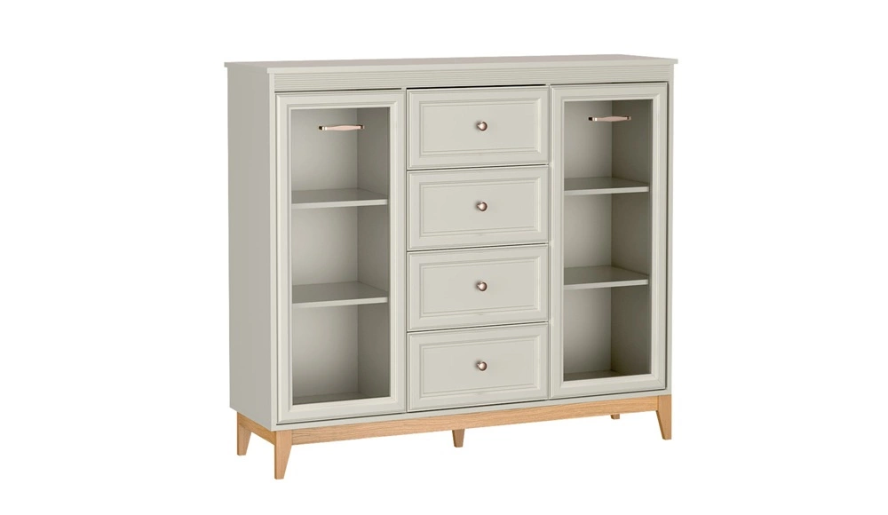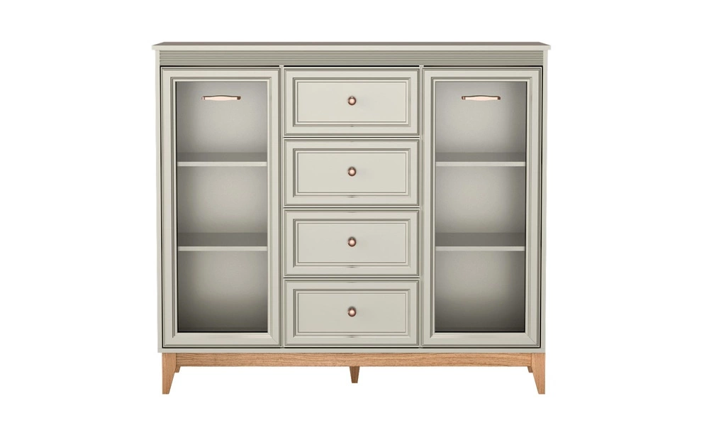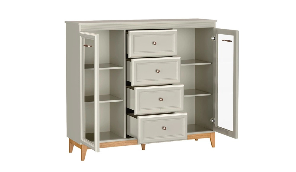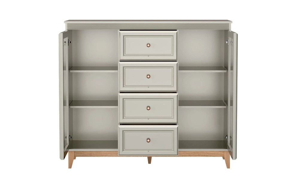 Przeszklony front to element, który przyciąga wzrok oraz pozwoli na wyeksponowanie dodatków stanowiących dekoracje salonu. Delikatne frezowania i ozdobne listwy wykonane z płyty MDF nadają komodzie wyjątkowego uroku. Stabilne nogi z litego dębowego drewna gwarantują trwałość i naturalne piękno. Stylowe, metalowe uchwyty to elegancki detal, który idealnie współgra z ciepłym kolorem korpusu. Komoda do salonu wyposażona jest w system cichego domykania drzwi i szuflad. Zastosowany system zwiększa komfort codziennego użytkowania.