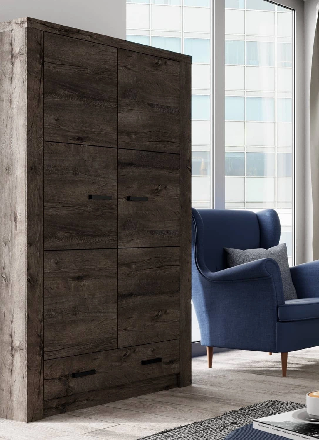 Szafa jest skonstruowana z 2 drzwi oraz 1 szuflady. Szafa gwarantuje komfortowe i bezproblemowe korzystanie oraz trwałość całego mebla przez wiele lat użytkowania. Głęboka, ciemna kolorystyka świetnie odnajdzie się w odważnych aranżacjach, dzięki czemu szafa na ubrania z powodzeniem sprawdzi się jako szafa do sypialni, jako szafa do przedpokoju lub szafa do pokoju dziecięcego. Szafy do pokoju Indiana doskonale sprawdzą się także w roli garderoby do przedpokoju.