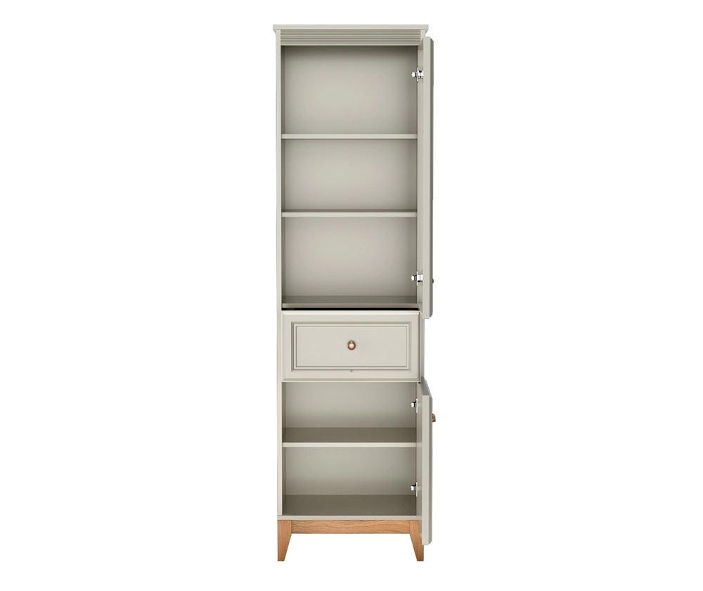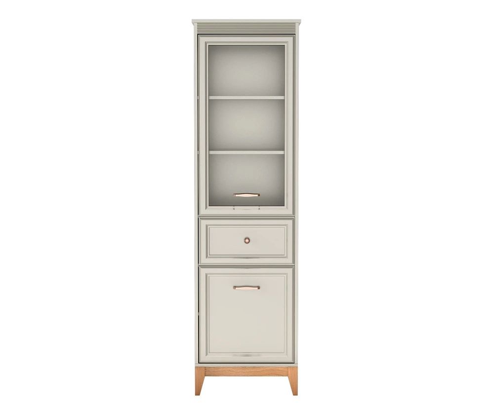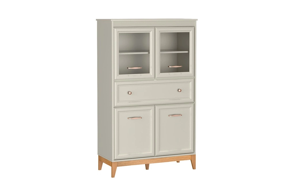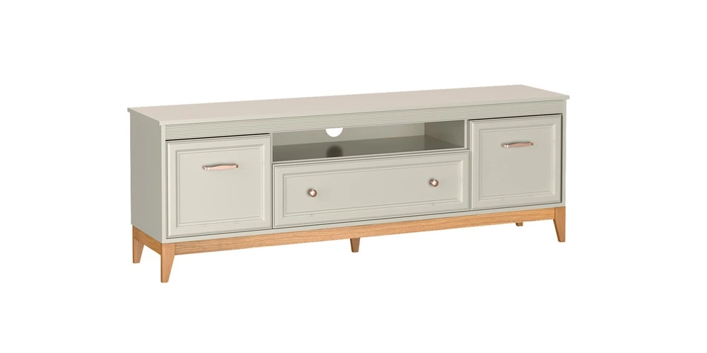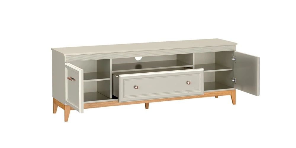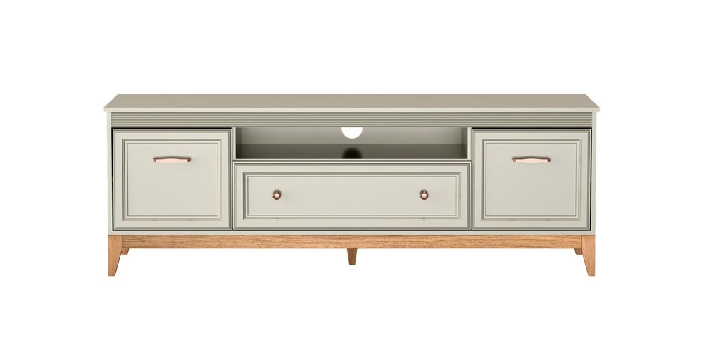 Meble do salonu Windsor to połączenie ponadczasowego stylu z funkcjonalnością, które wprowadzi do każdego wnętrza harmonię i elegancję. Subtelne frezowania na frontach, minimalistyczne uchwyty w kolorze miedzi oraz doskonale dobrane proporcje nadają meblom wyjątkowego charakteru. Naturalne drewniane akcenty ocieplają przestrzeń, tworząc przytulne, a jednocześnie stylowe wnętrze. Delikatny kaszmirowy odcień kolekcji Windsor sprawia, że doskonale komponuje się zarówno w klasycznych aranżacjach, jak i tych w stylu modern classic.