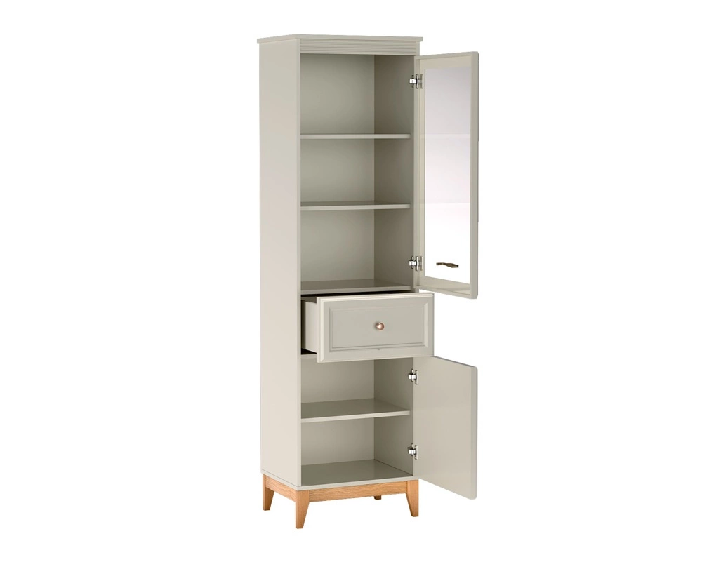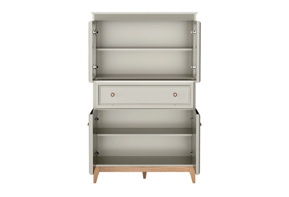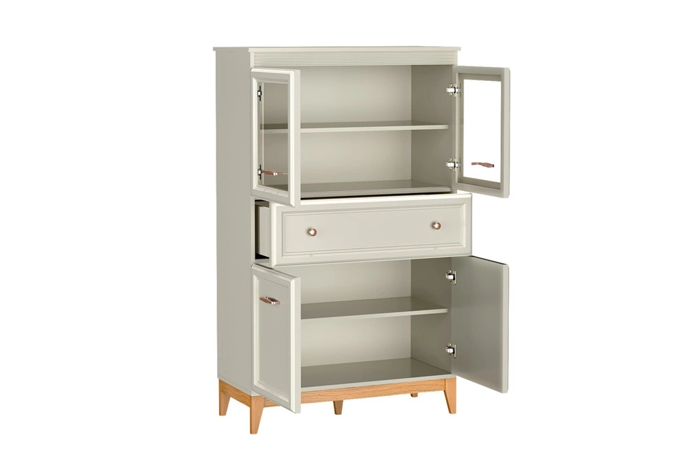 Delikatne frezowania i ozdobne listwy wykonane z płyty MDF nadają meblom wyjątkowego uroku. Stabilne nogi z litego dębowego drewna gwarantują trwałość i naturalne piękno. Stylowe, metalowe uchwyty to elegancki detal, który idealnie współgra z ciepłym kolorem korpusów. Meblościanka do salonu wyposażona jest w system cichego domykania drzwi i szuflad. Zastosowany system zwiększa komfort codziennego użytkowania.