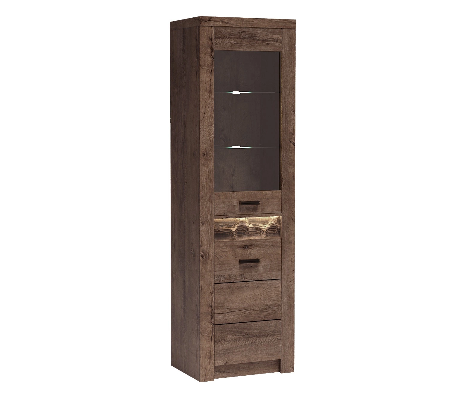 Witryna Indiana 56 cm jesion ciemny stylowa witryna do salonu elementy z bezpiecznego szkła ozdobna deska na froncie witryny oświetlona LED