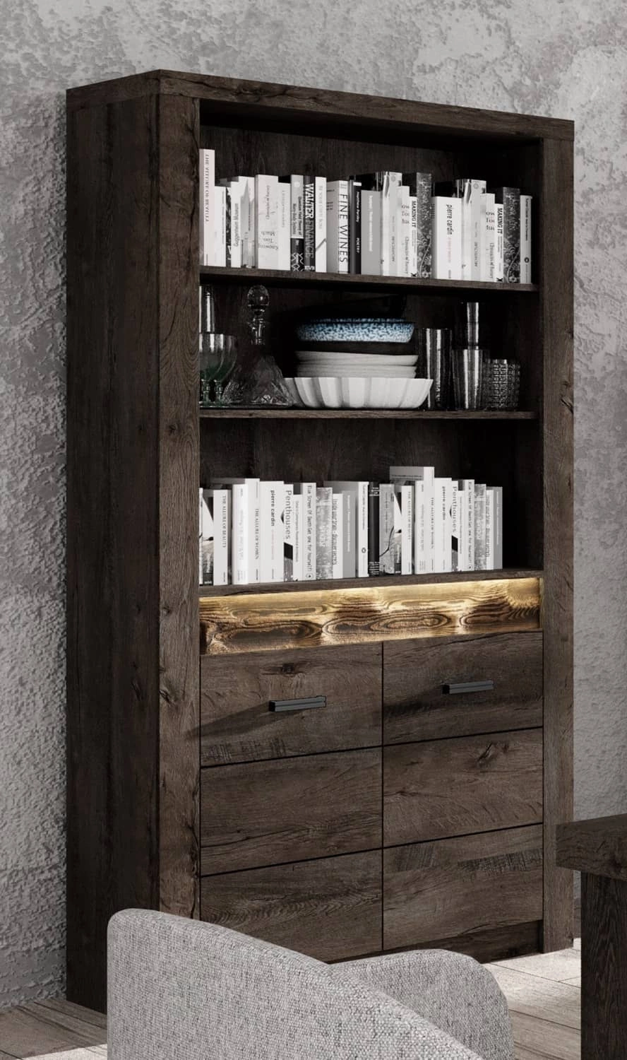 Regał Indiana 96 cm jesion ciemny elegancka stylistyka regału z drzwiami ozdobna deska na froncie regału oświetlona LED