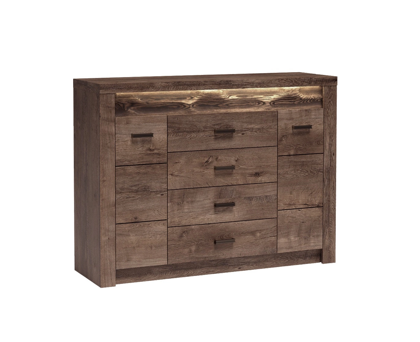 Komoda z szufladami Indiana 137 cm jesion ciemny elegancka stylistyka komody ozdobna deska na froncie komody oświetlona LED