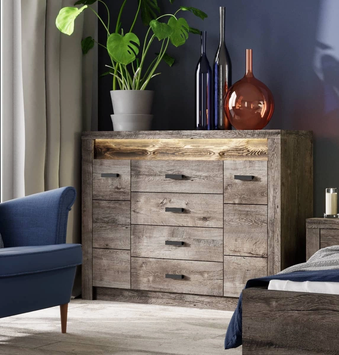 - Komoda z szufladami Indiana to propozycja dla osób ceniących nowoczesne aranżacje. Prosta forma i ozdobna deska z drewna sosnowego, którą uwydatnia oświetlenie LED, doskonale wpasuje się w każde wnętrze, dodając mu elegancji i przestronności.