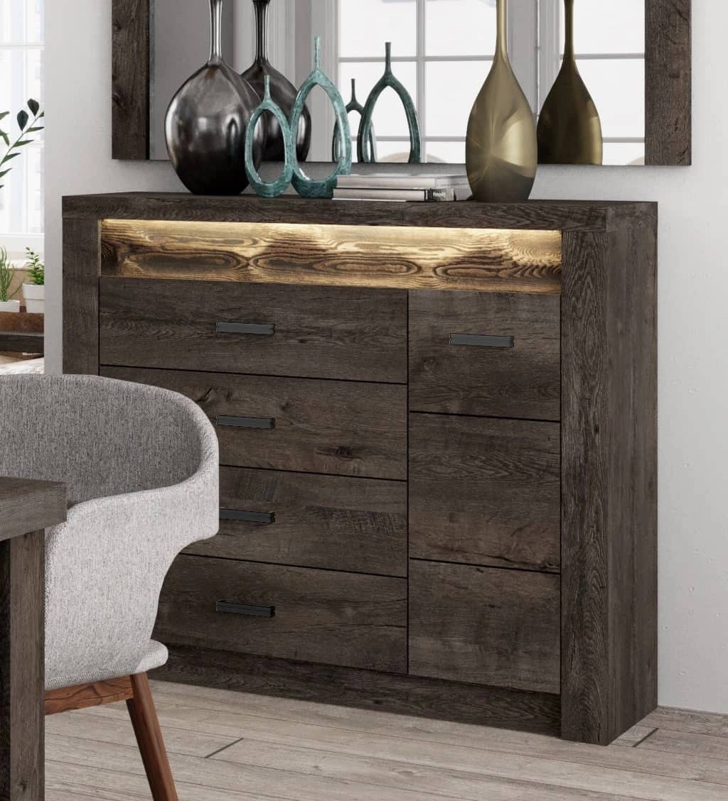 Komoda do salonu z kolekcji Indiana zachwyci wszystkich miłośników wyrafinowanych aranżacji. Modna kolorystyka i staranne wykończenie komody nada wnętrzu elegancji i estetycznego wyglądu. Komoda z szufladami wyróżnia się ozdobną deską zdobiąca front wykonaną z drewna sosnowego, którą uwydatnia subtelne oświetlenie LED, co stanowi elegancki detal przyciągający wzrok. Dopełnieniem frontów komody Indiana są metalowe czarne uchwyty, które podkreślają elegancję komody. Designerska konstrukcja komody idealnie koresponduje z aktualnymi trendami wnętrzarskimi dzięki czemu meble z kolekcji Indiana łatwo zaaranżować w salonie, sypialni, jadalni lub w gabinecie.