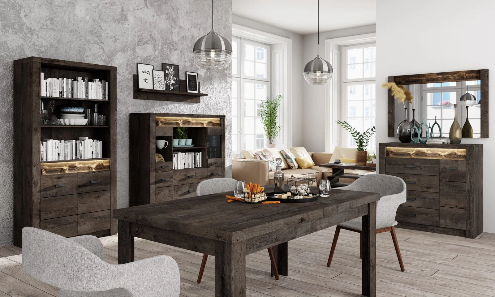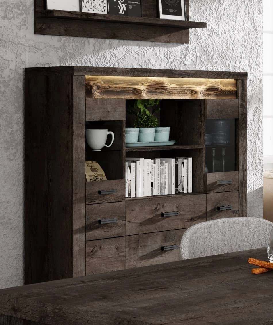 Komoda do salonu z kolekcji Indiana zachwyci wszystkich miłośników wyrafinowanych aranżacji. Modna kolorystyka i staranne wykończenie komody nada wnętrzu elegancji i estetycznego wyglądu. Komoda z przeszkleniem wyróżnia się ozdobną deską zdobiąca front wykonaną z drewna sosnowego, którą uwydatnia subtelne oświetlenie LED, co stanowi elegancki detal przyciągający wzrok. Dopełnieniem frontów komody Indiana są metalowe czarne uchwyty, które podkreślają elegancję komody. Designerska konstrukcja komody idealnie koresponduje z aktualnymi trendami wnętrzarskimi dzięki czemu meble z kolekcji Indiana łatwo zaaranżować w salonie, sypialni, jadalni lub w gabinecie.