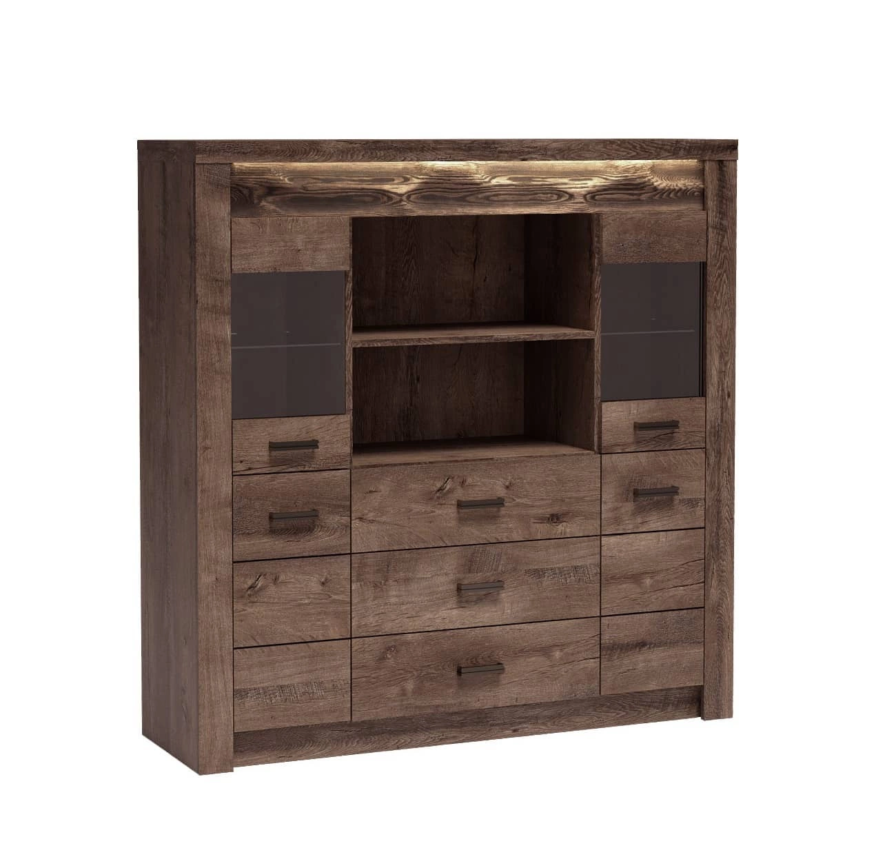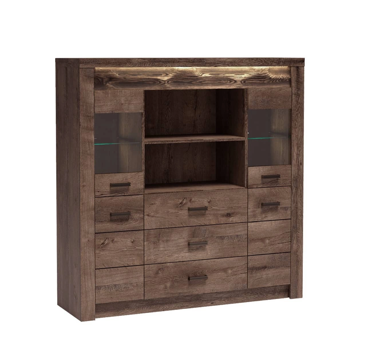 Komoda z szufladami Indiana 137 cm jesion ciemny gustowna stylistyka komody z przeszkleniem ozdobna deska na froncie komody oświetlona LED