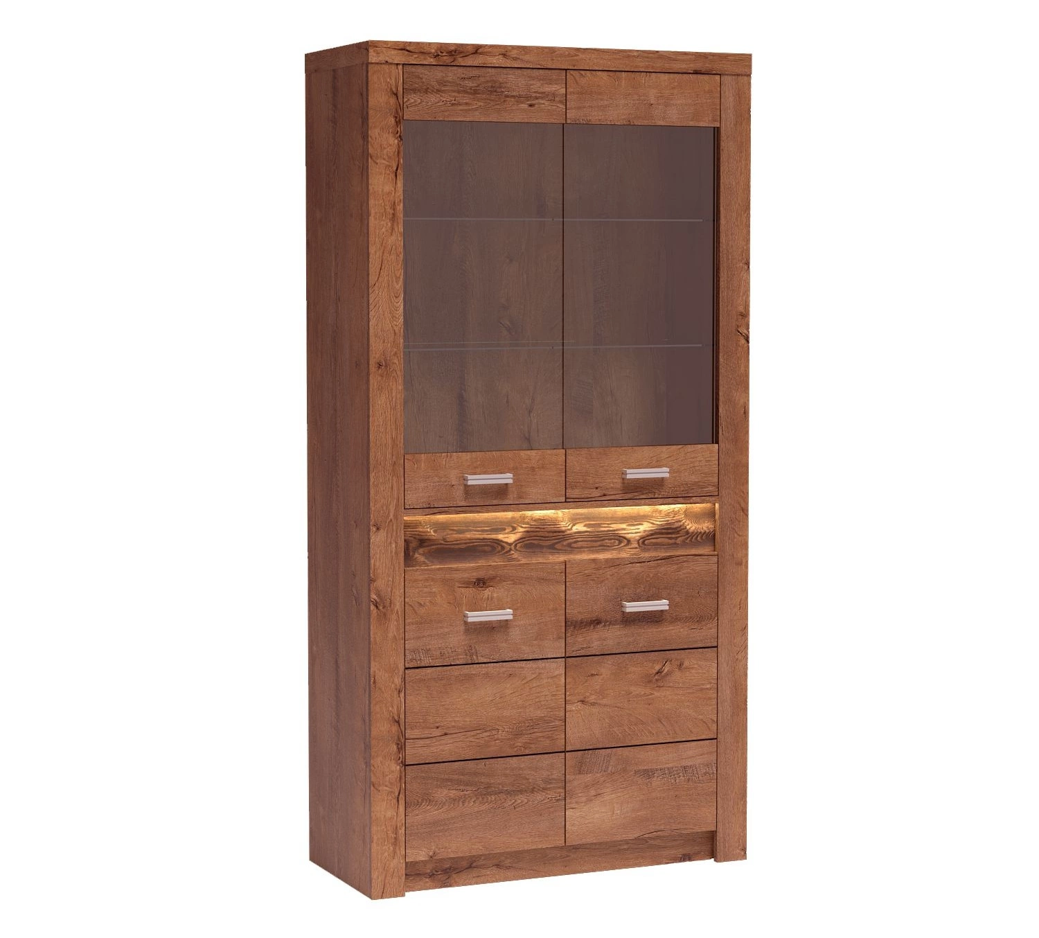 - Witryna Indiana to idealna propozycja dla osób ceniących nowoczesne aranżacje. Dzięki prostej formie i ozdobnej desce z drewna sosnowego, którą uwydatnia oświetlenie LED, mebel doskonale wpasuje się w każde wnętrze, dodając mu elegancji i przestronności.