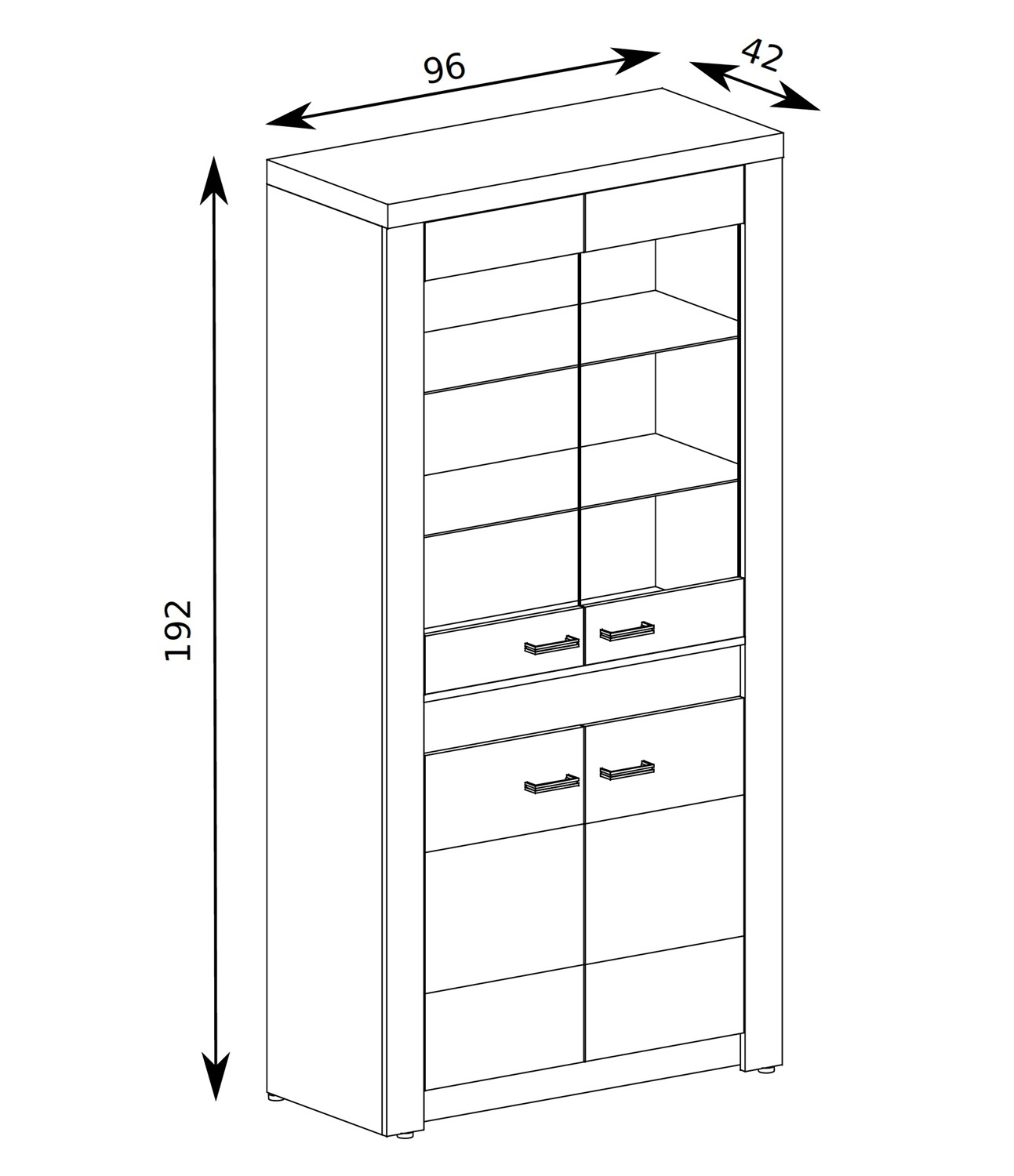 Witryna jest skonstruowana 4 drzwi. Witryna wykonana została z wysokiej jakości płyty laminowanej, która charakteryzuje się odpornością na wpływ czynników zewnętrznych takich jak obicia, uderzenia i niefortunne zadrapania. Dzięki prostej formie oraz uniwersalności witryny szklane Indiana świetnie sprawdzą się w roli witryny do salonu, witryny do pokoju dziennego lub witryny do jadalni, a także witryny na książki.