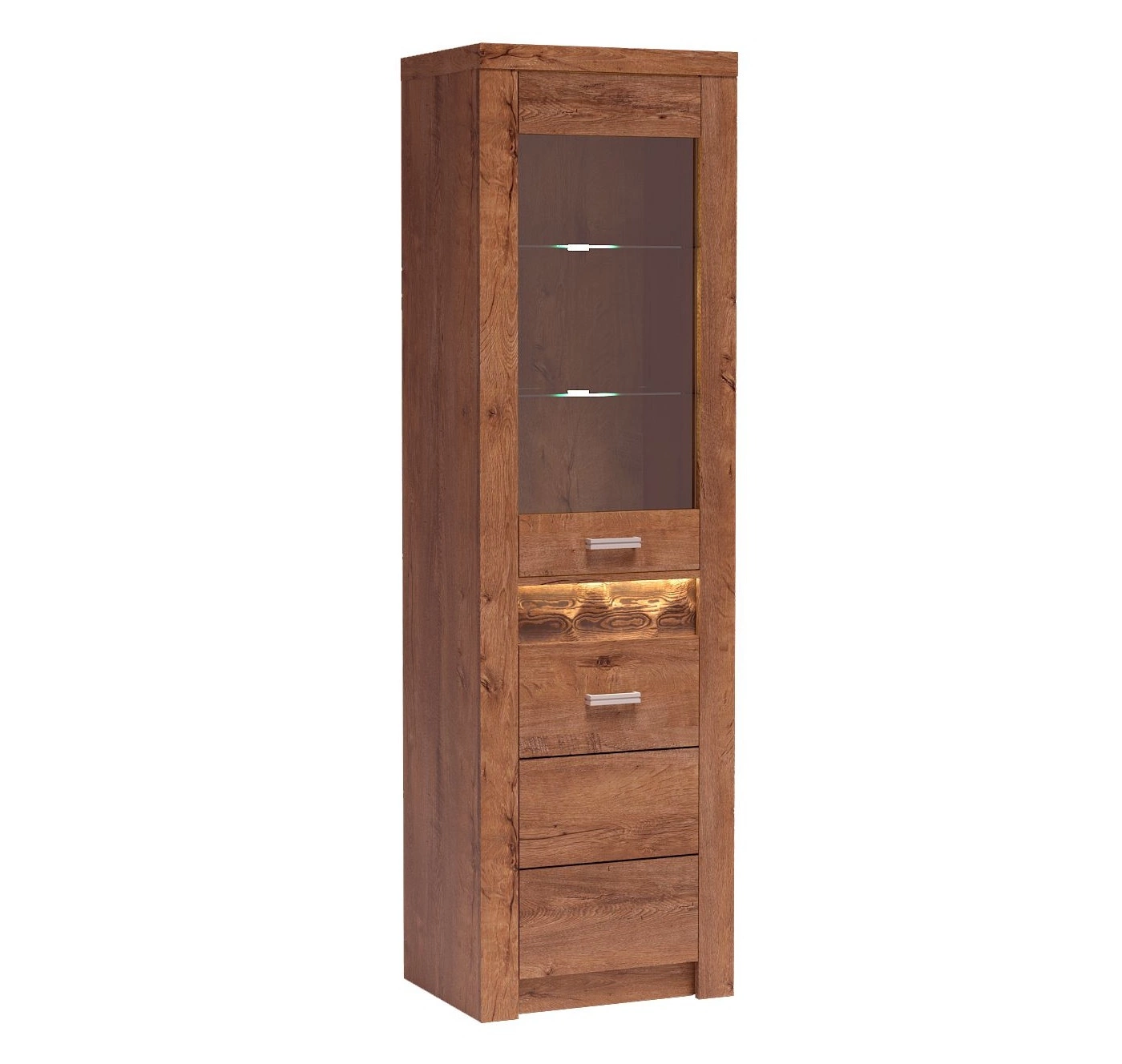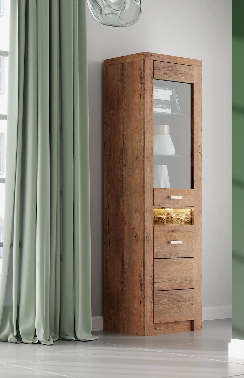 - Witryna Indiana to idealna propozycja dla osób ceniących nowoczesne aranżacje. Dzięki prostej formie i ozdobnej desce z drewna sosnowego, którą uwydatnia oświetlenie LED, mebel doskonale wpasuje się w każde wnętrze, dodając mu elegancji i przestronności.