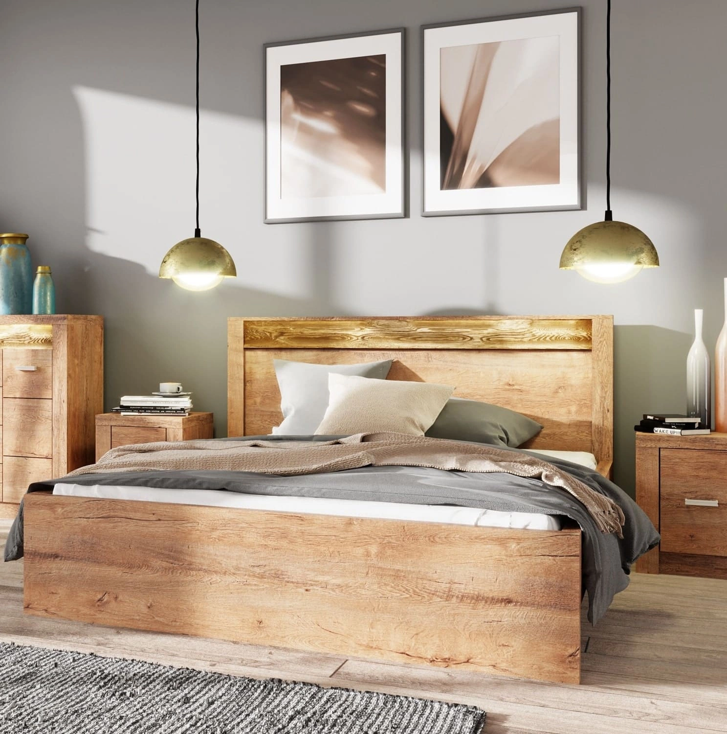 Łóżko z kolekcji Indiana zachwyci wszystkich miłośników wyrafinowanych aranżacji. Modna kolorystyka i staranne wykończenie łóżka nada wnętrzu elegancji i estetycznego wyglądu. Łóżko wyróżnia się ozdobną deską zdobiąca zagłówek wykonaną z drewna sosnowego, którą uwydatnia subtelne oświetlenie LED, co stanowi elegancki detal przyciągający wzrok.