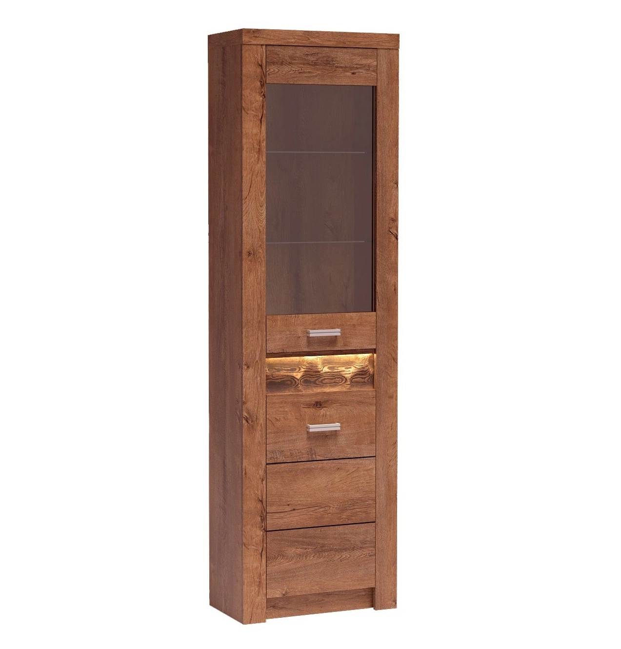 • Witryna Indiana to idealna propozycja dla osób ceniących nowoczesne aranżacje. Dzięki prostej formie i ozdobnej desce z drewna sosnowego, którą uwydatnia oświetlenie LED, mebel doskonale wpasuje się w każde wnętrze, dodając mu elegancji i przestronności.