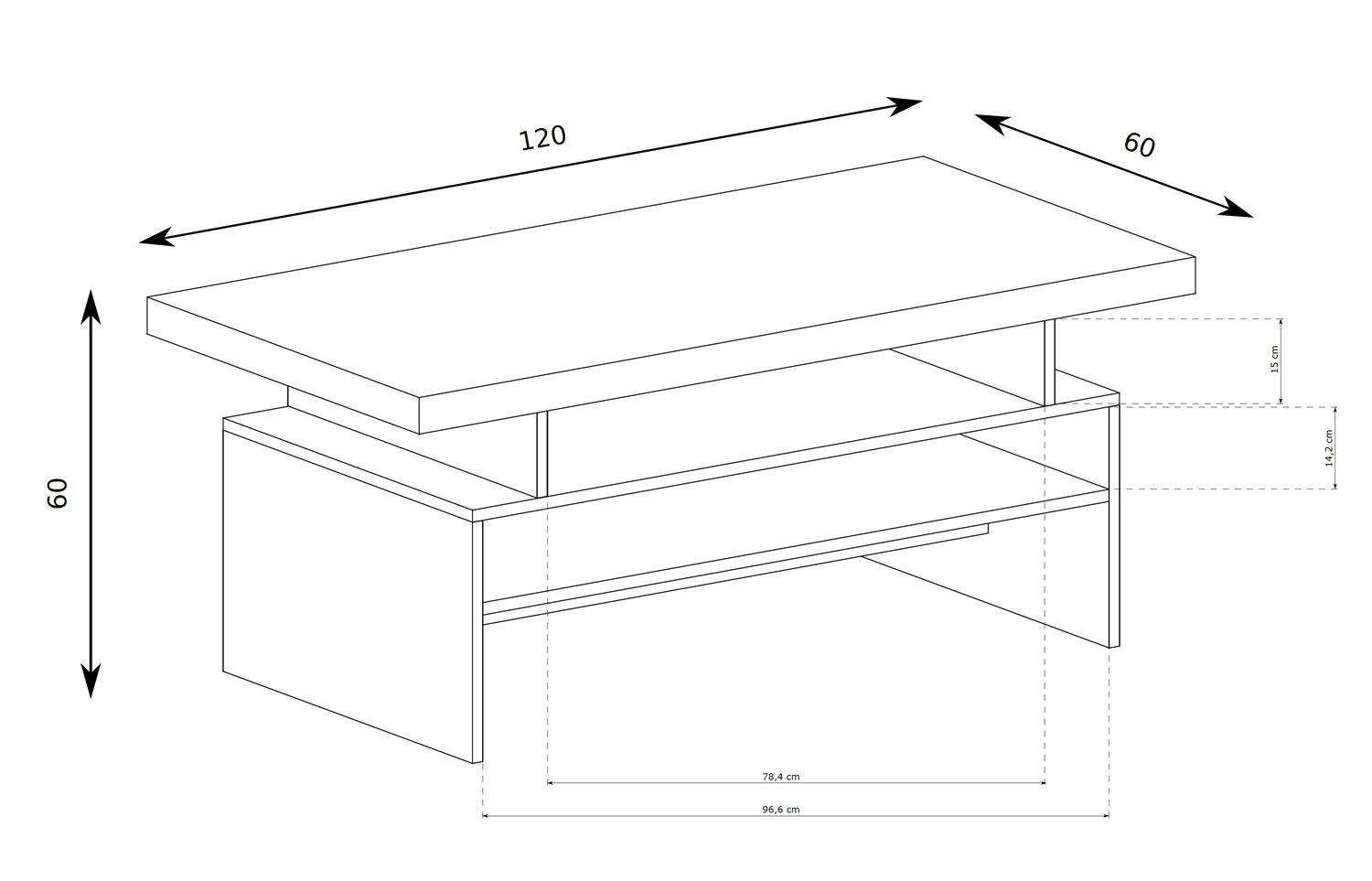 Stolik wykonany z płyty meblowej to gwarancja trwałości i stabilności przy jednoczesnym utrzymaniu funkcjonalności. Półki znajdujące się poniżej blatu zapewniają dodatkową przestrzeń na ulubione książki lub czasopisma. Stolik kawowy gwarantuje komfortowe i bezproblemowe korzystanie oraz trwałość całego mebla przez wiele lat użytkowania.