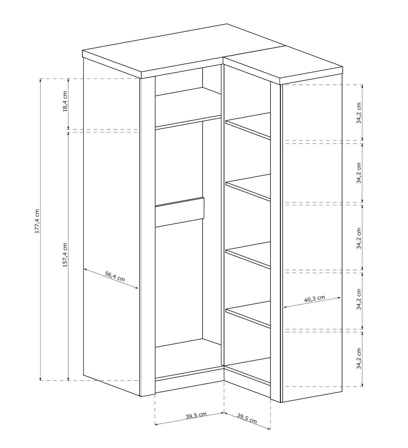 Szafa narożna Indiana dzieli się na część z drążkiem na ubrania wiszące oraz część z głębokimi półkami. Szafa na ubrania została wykonana z wysokiej jakości płyty laminowanej, która charakteryzuje się dużą odpornością na wpływ czynników zewnętrznych takich jak obicia, uderzenia i niefortunne zadrapania. Przemyślany układ wnętrza szafy pozwoli na harmonijne uprządkowanie każdej garderoby oraz niezbędnych akcesoriów, zachowując przy tym estetykę i elegancję.