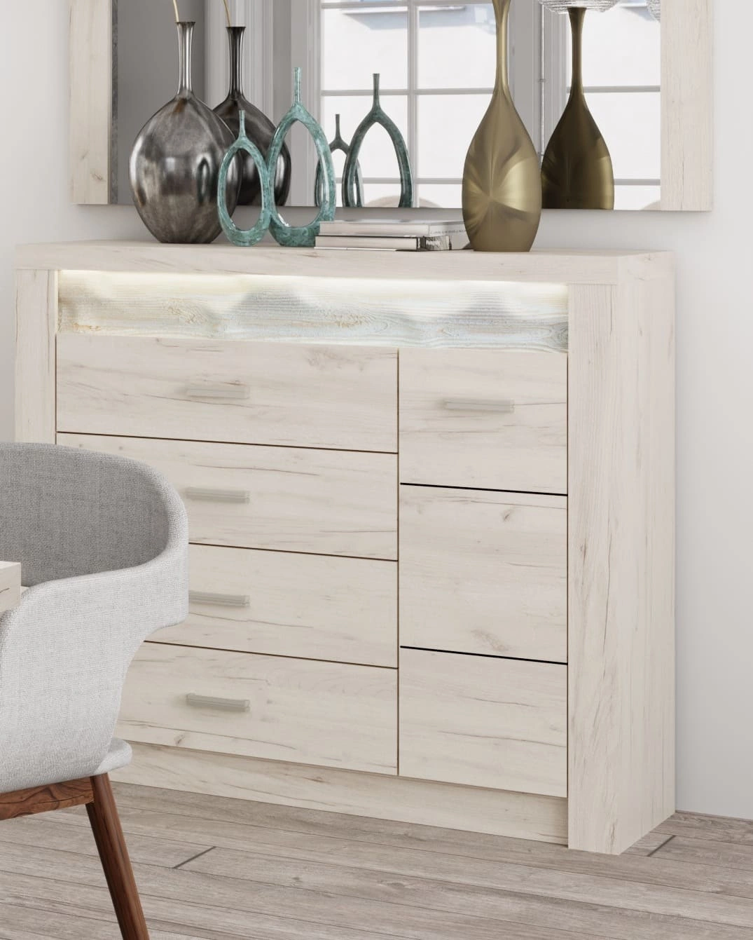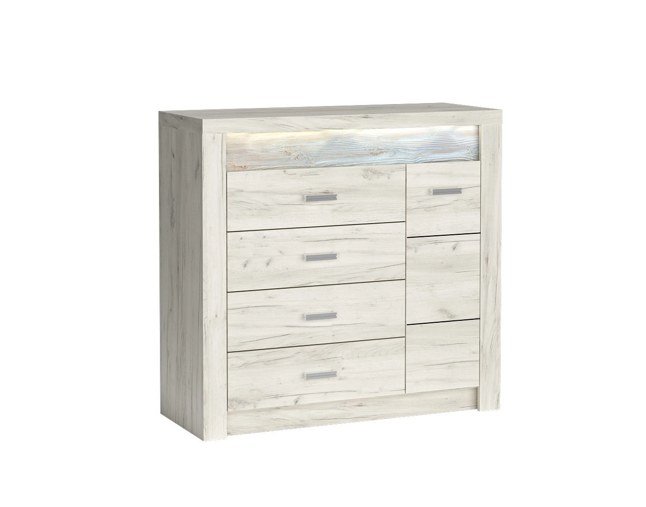 Komoda z szufladami Indiana 108 cm kraft biały elegancka stylistyka komody ozdobna deska na froncie komody oświetlona LED