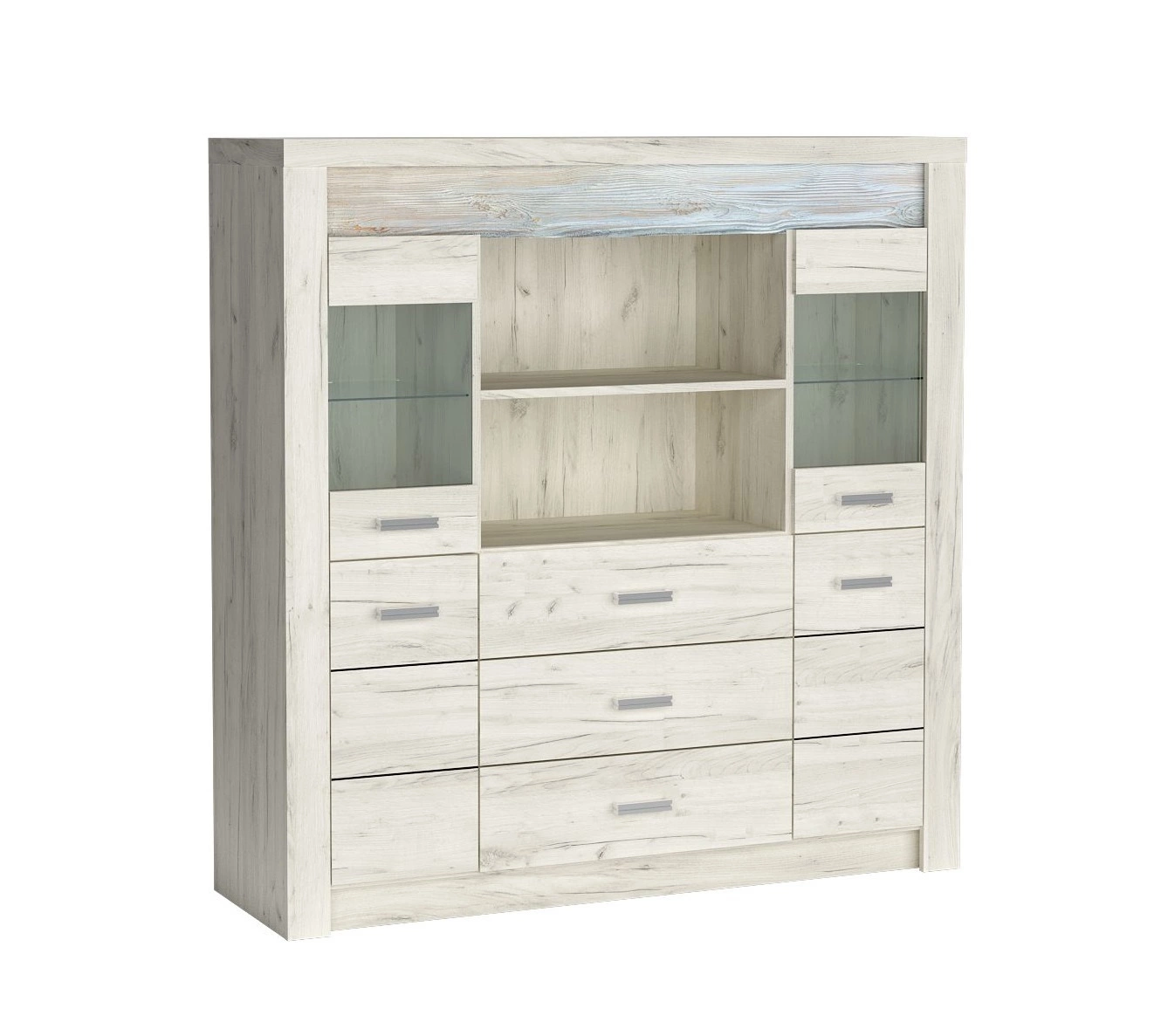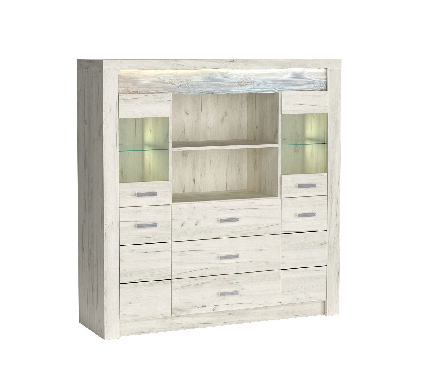 Komoda do salonu z kolekcji Indiana zachwyci wszystkich miłośników wyrafinowanych aranżacji. Modna kolorystyka i staranne wykończenie komody nada wnętrzu elegancji i estetycznego wyglądu. Komoda z przeszkleniem wyróżnia się ozdobną deską zdobiąca front wykonaną z drewna sosnowego, którą uwydatnia subtelne oświetlenie LED, co stanowi elegancki detal przyciągający wzrok. Dopełnieniem frontów komody Indiana są metalowe srebrne uchwyty, które podkreślają elegancję komody. Designerska konstrukcja komody idealnie koresponduje z aktualnymi trendami wnętrzarskimi dzięki czemu meble z kolekcji Indiana łatwo zaaranżować w salonie, sypialni, jadalni lub w gabinecie.