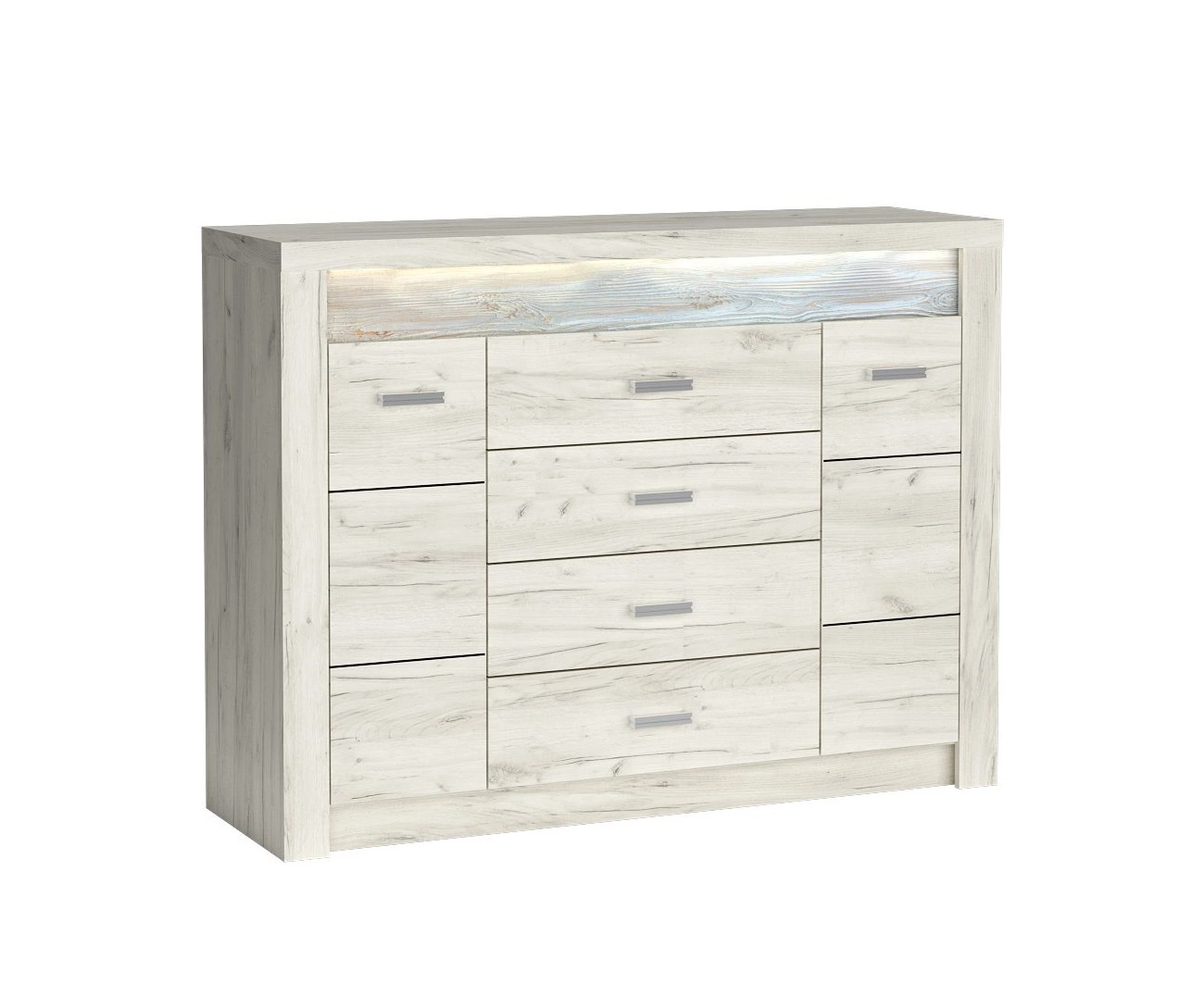 Zestaw mebli do sypialni Indiana zachwyci wszystkich miłośników wyrafinowanych aranżacji. Modna kolorystyka i staranne wykończenie brył nada wnętrzu elegancji i estetycznego wyglądu. Meble do sypialni wyróżniają się ozdobną deską zdobiąca front wykonaną z drewna sosnowego, którą uwydatnia subtelne oświetlenie LED, co stanowi elegancki detal przyciągający wzrok. Dopełnieniem frontów mebli Indiana są metalowe srebrne uchwyty, które podkreślają elegancję. Obecność mebli z kolekcji Indiana stanie się stylowym wykończeniem sypialni oraz nada niepowtarzalnego klimatu.