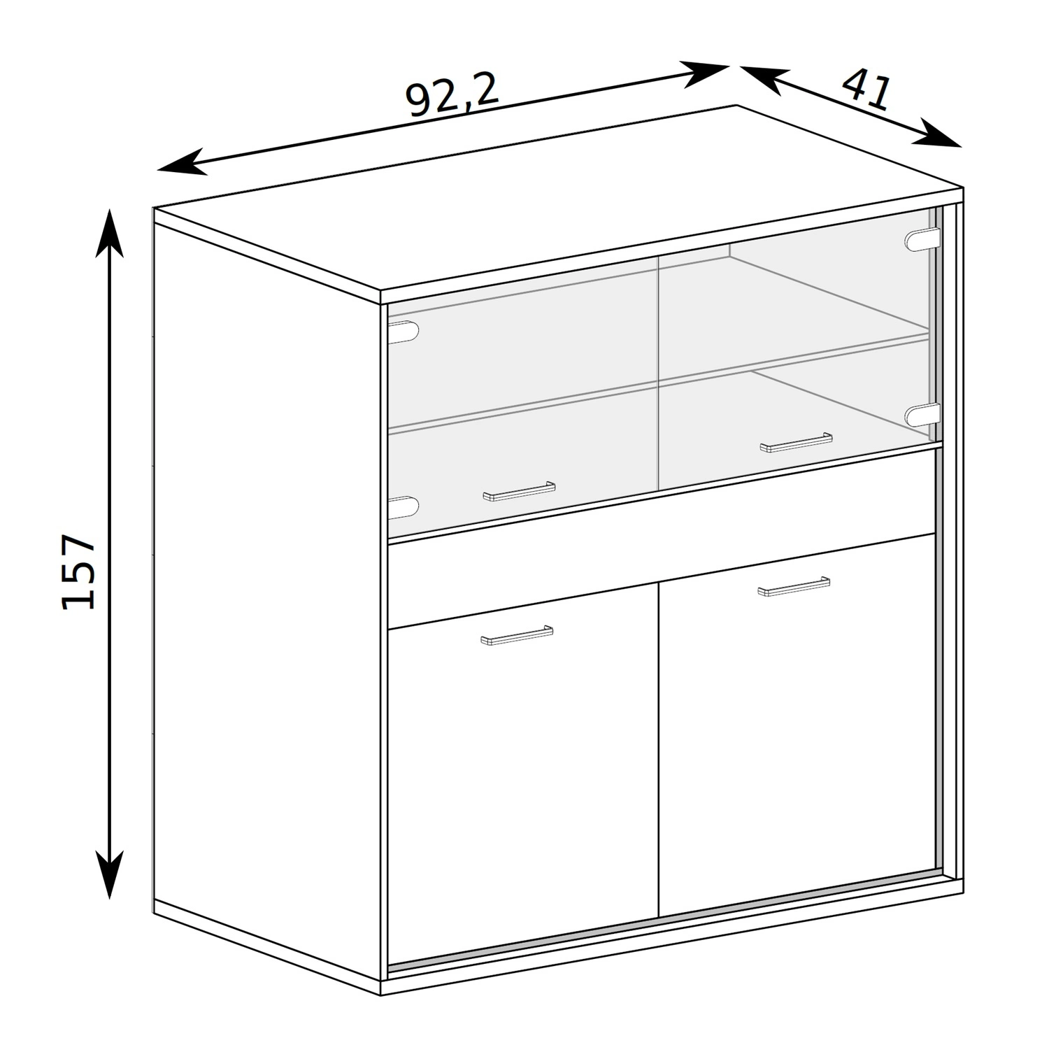 Witryna jest skonstruowana z 4 drzwi oraz 1 szuflady. Standardowym wyposażeniem są zawiasy oraz prowadnice szuflad z systemem cichego domykania. Zastosowany system zwiększa komfort i bezpieczeństwo użytkowania mebli. Witryna wykonana została z wysokiej jakości płyty laminowanej, która charakteryzuje się odpornością na wpływ czynników zewnętrznych takich jak obicia, uderzenia i niefortunne zadrapania. Dzięki prostej formie oraz uniwersalności witryny szklane Mediolan świetnie sprawdzą się w roli witryny do salonu, witryny do pokoju dziennego lub witryny do jadalni, a także witryny na książki.