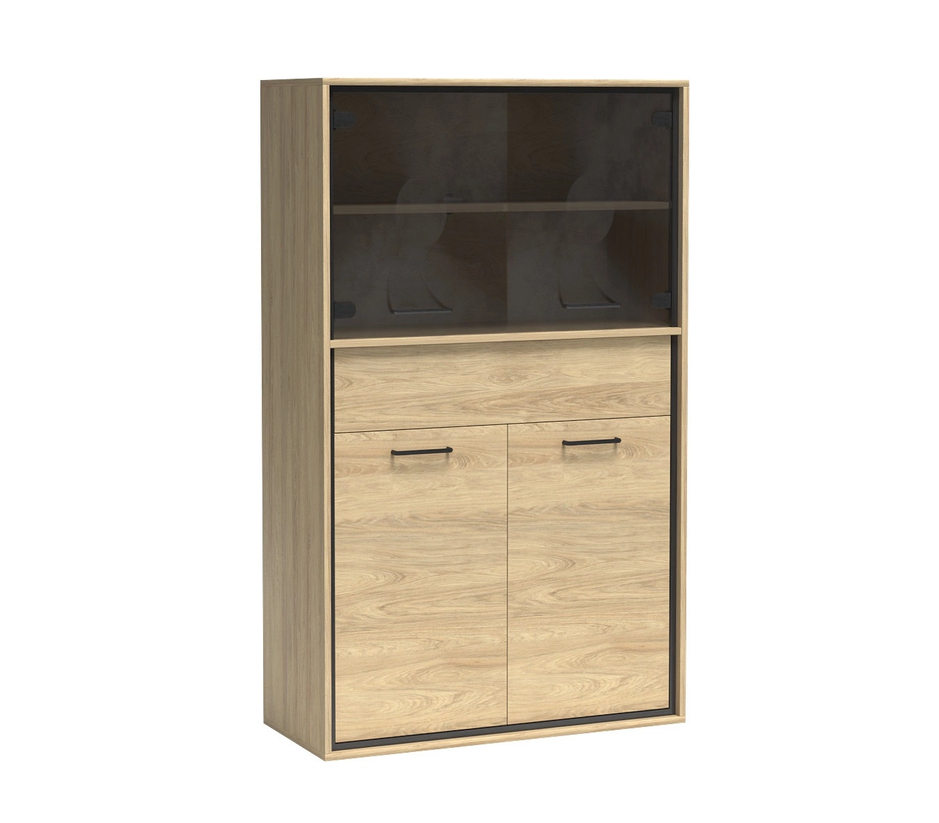 Zamykane szafki pomieszczą wszystkie rzeczy oraz niezbędne akcesoria. Przeszklony front witryny pozwoli wyeksponować dodatki stanowiące dekorację salonu. Przeszklone fronty wykonane są z bezpiecznego szkła hartowanego. Funkcjonalny, bezuchwytowy system otwierania szuflady push to open to kolejna zaleta witryny do salonu. Witryna na książki gwarantuje komfortowe i bezproblemowe korzystanie oraz trwałość całego mebla przez wiele lat użytkowania.