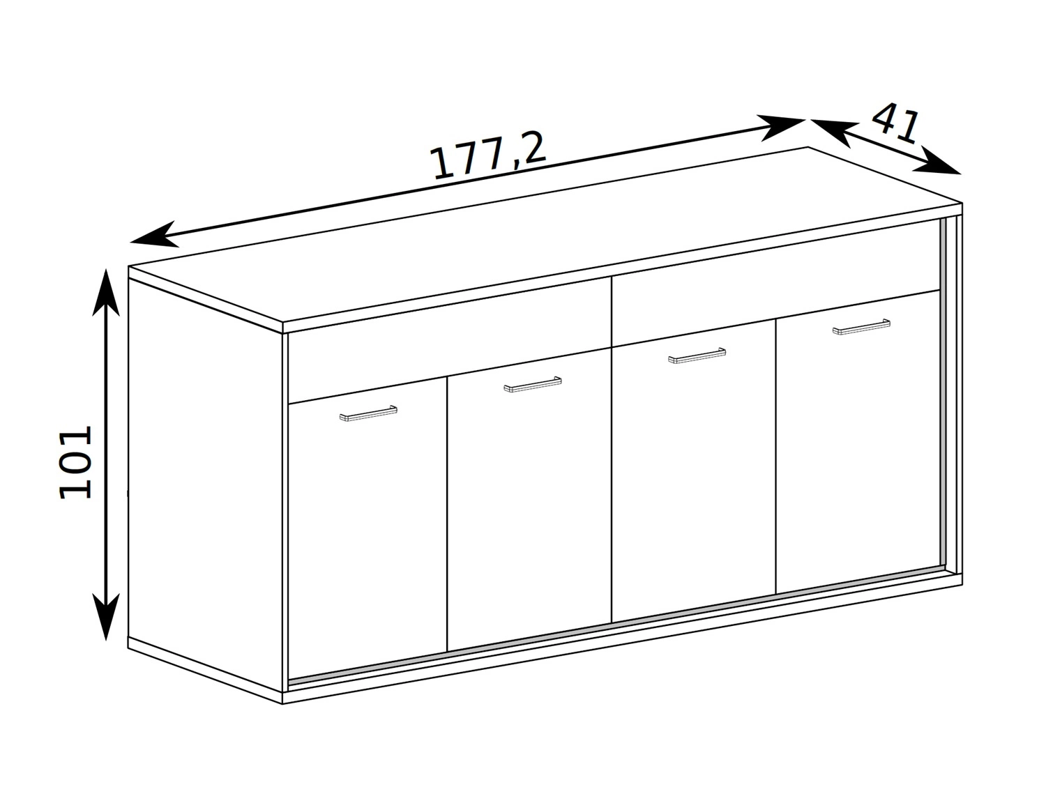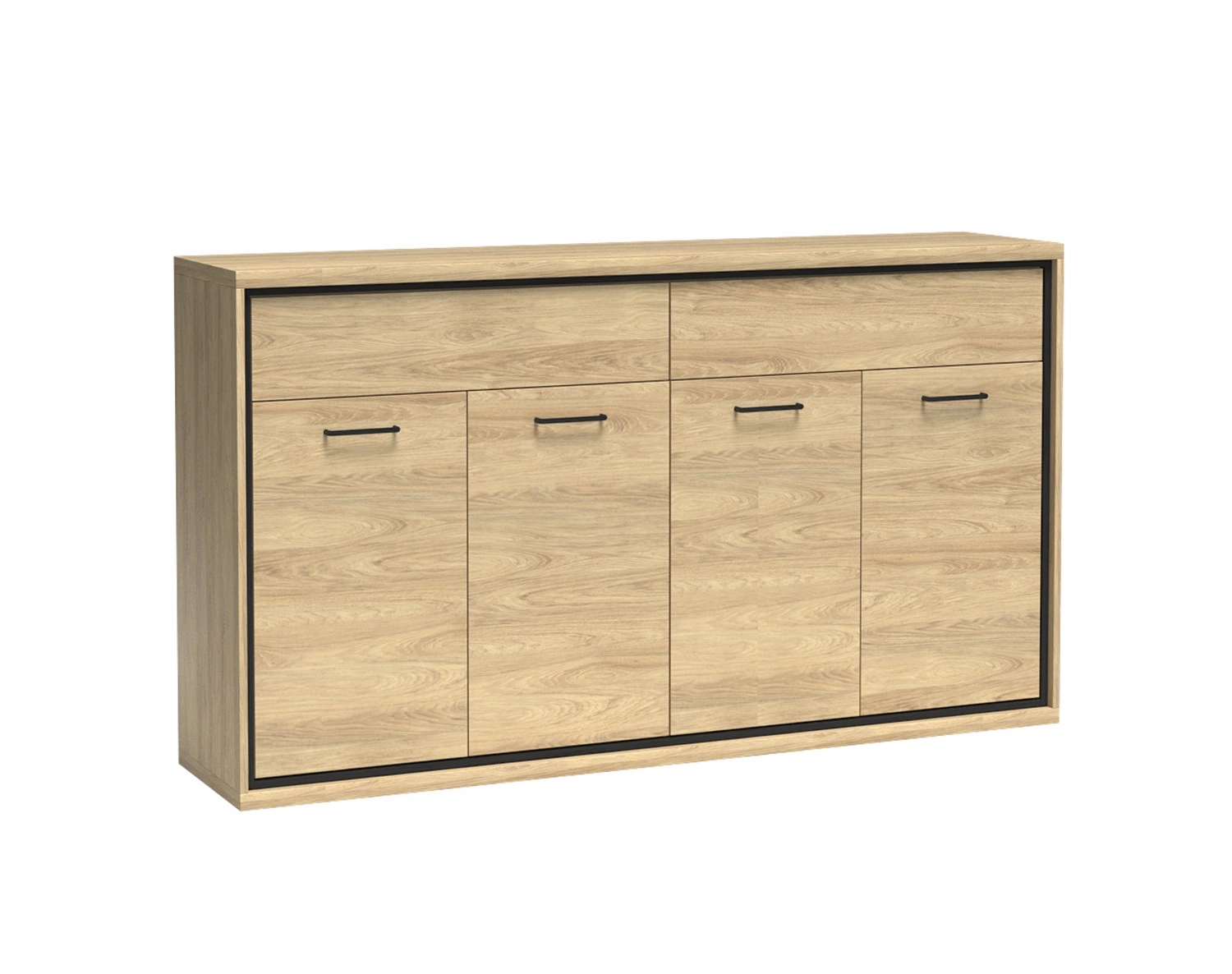 Komoda do salonu wykonana została z wysokiej jakości płyty laminowanej, która charakteryzuje się odpornością na wpływ czynników zewnętrznych takich jak obicia, uderzenia i niefortunne zadrapani. Komoda do salonu Mediolan została zaprojektowana w sposób funkcjonalny i użytkowy, oferując dużo miejsca do przechowywania. Pojemne szuflady oraz zamykane szafki pomieszczą wszystkie rzeczy oraz niezbędne akcesoria. Funkcjonalny, bezuchwytowy system otwierania szuflad push to open to kolejna zaleta komody do salonu.