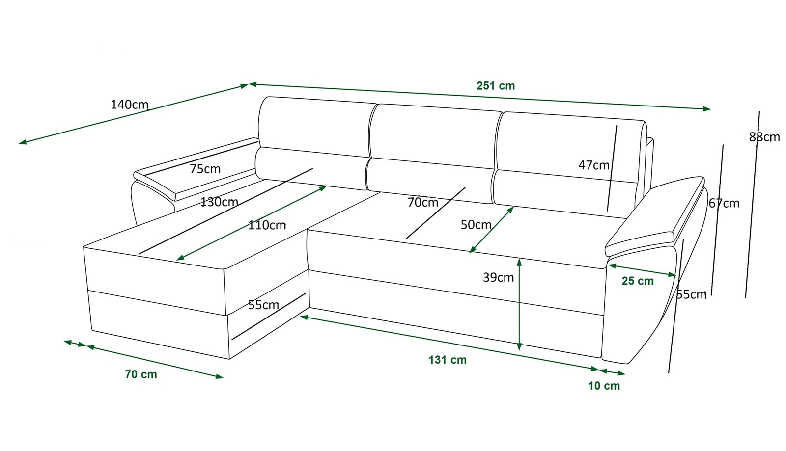 Dzięki swoim wymiarom oraz szerokiej funkcjonalności narożnik z funkcją spania świetnie sprawdzi się jako narożnik do pokoju dziennego lub jako narożnik rozkładany do pokoju gościnnego. Narożnik z funkcja spania to także świetna alternatywa łóżka w pokoju młodzieżowym. Szerokość narożnika 251 cm, wysokość 88 cm oraz głębokość 140 cm. Powierzchnia spania narożnika wynosi 130x200 cm. Wysokość siedziska mebla to 39 cm, a wysokość oparcia wynosi 47 cm. Pianka poliuretanowa T30 to materiał, z którego wykonane zostało siedzisko narożnika. Miękkie poduchy oparciowe zapewnią wysoki komfort podczas codziennego odpoczynku, który docenisz Ty a także goście, którzy zasiądą na tym wyjątkowym narożniku.