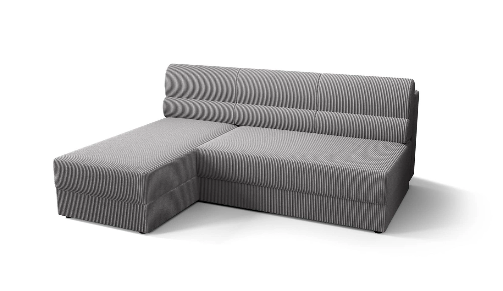 Narożnik z funkcją spania Fogu szary popiel lewostronny narożnik o prostym designie pokryty sztruksową tkaniną pojemnik na pościel
