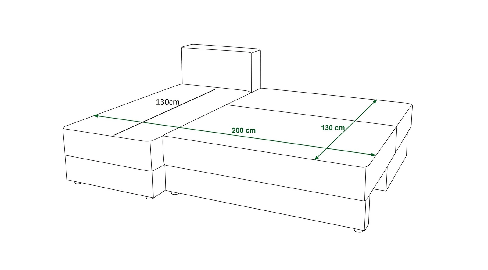Dzięki swoim wymiarom oraz szerokiej funkcjonalności narożnik z funkcją spania świetnie sprawdzi się jako narożnik do pokoju dziennego lub jako narożnik rozkładany do pokoju gościnnego. Narożnik z funkcja spania to także świetna alternatywa łóżka w pokoju młodzieżowym. Szerokość narożnika 201 cm, wysokość 86 cm oraz głębokość 140 cm. Powierzchnia spania narożnika wynosi 130x200 cm. Wysokość siedziska mebla to 39 cm, a wysokość oparcia wynosi 47 cm. Pianka poliuretanowa T30 to materiał, z którego wykonane zostało siedzisko narożnika. Miękkie poduchy oparciowe zapewnią wysoki komfort podczas codziennego odpoczynku, który docenisz Ty a także goście, którzy zasiądą na tym wyjątkowym narożniku.