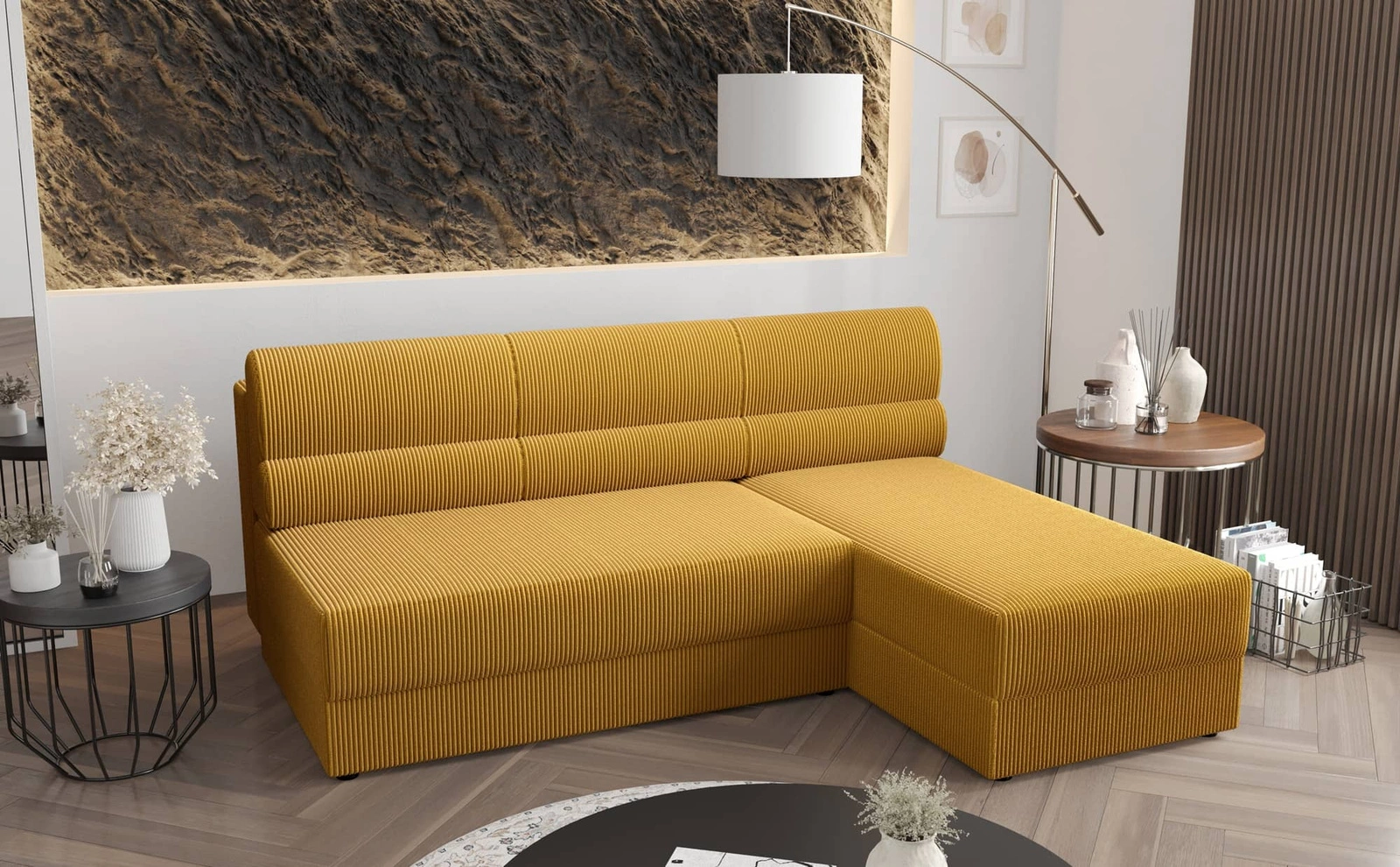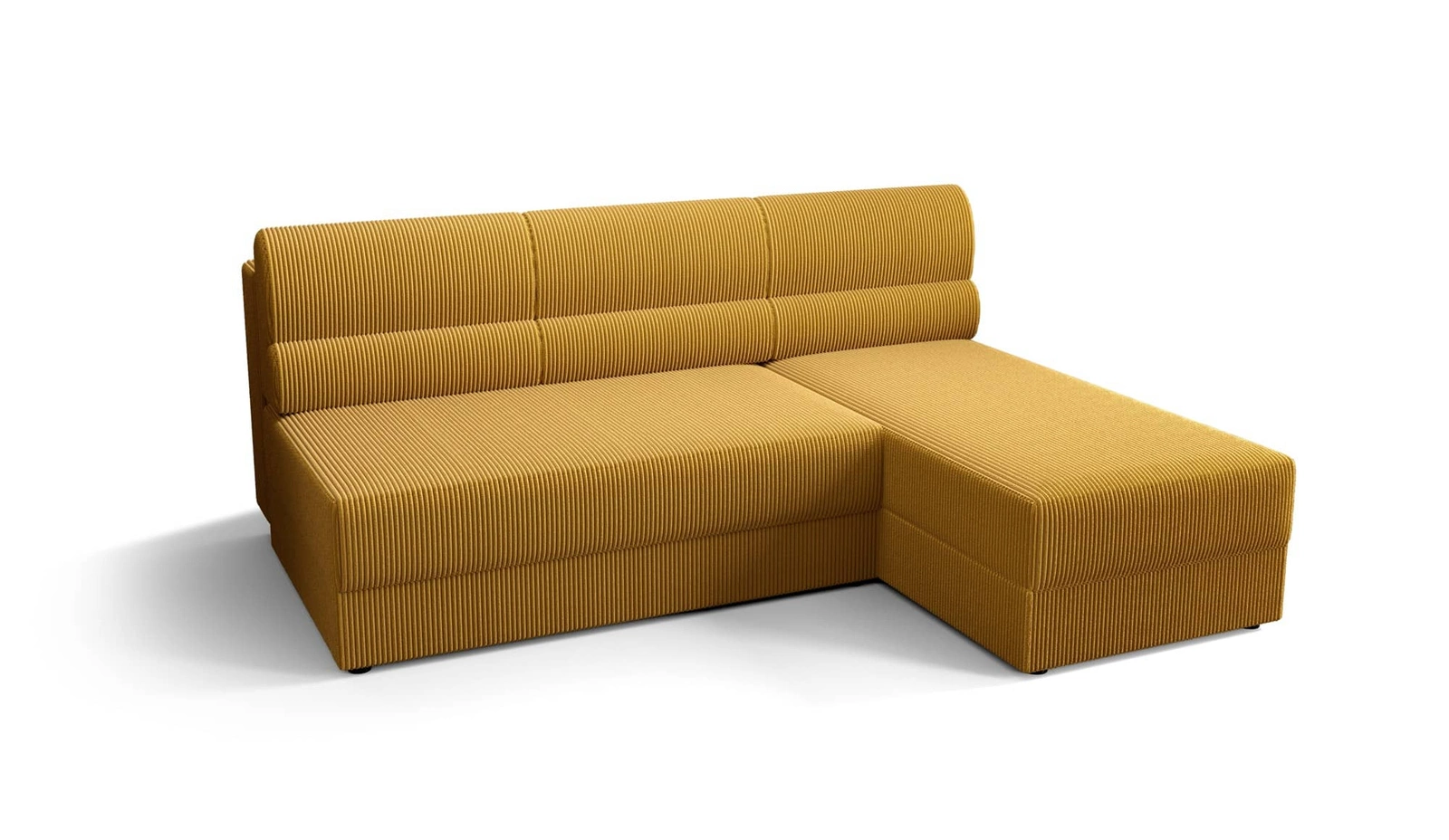 Narożnik z funkcją spania Fogu miodowy prawostronny stylowy narożnik o prostym designie pokryty sztruksową tkaniną pojemnik na pościel