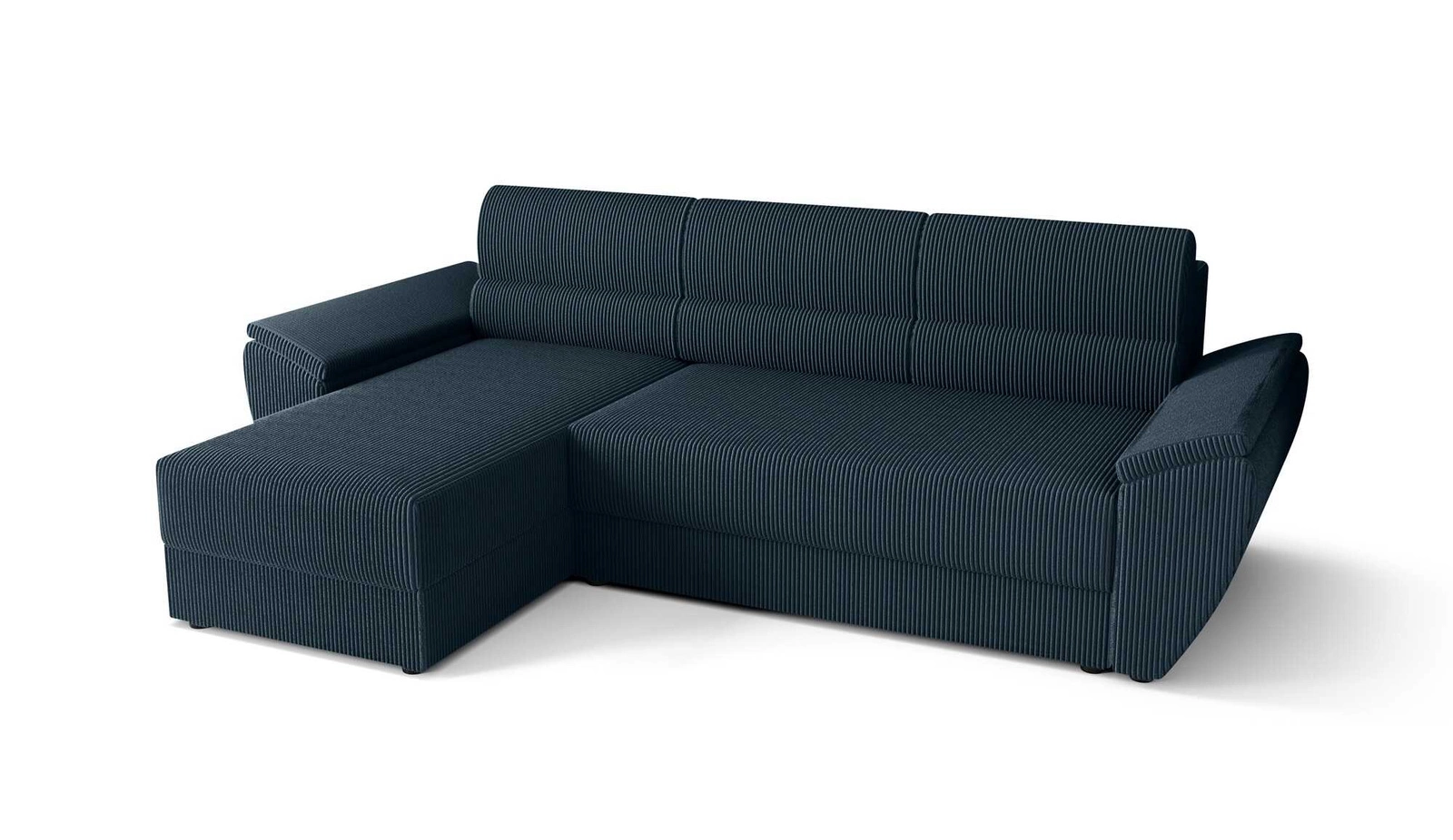 Narożnik z funkcją spania Fogu II niebieski lewostronny stylowy narożnik z komfortowymi podłokietnikami i pojemnikiem na pościel