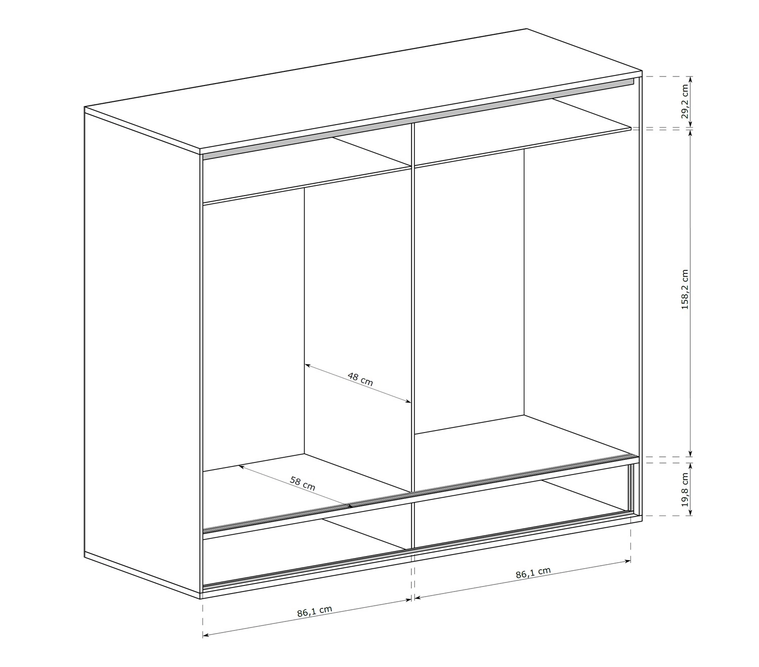 Szafa Mediolan została zaprojektowana w sposób funkcjonalny i użytkowy, oferując dużo miejsca do przechowywania. Wnętrze szafy do pokoju dzieli się na część z drążkami na ubrania wiszące oraz część z półkami. Szafa została wykonana z wysokiej jakości płyty laminowanej, która charakteryzuje się dużą odpornością na wpływ czynników zewnętrznych takich jak obicia, uderzenia i niefortunne zadrapania. Funkcjonalny, bezuchwytowy system otwierania szuflad push to open to kolejna zaleta szafy przesuwnej.
