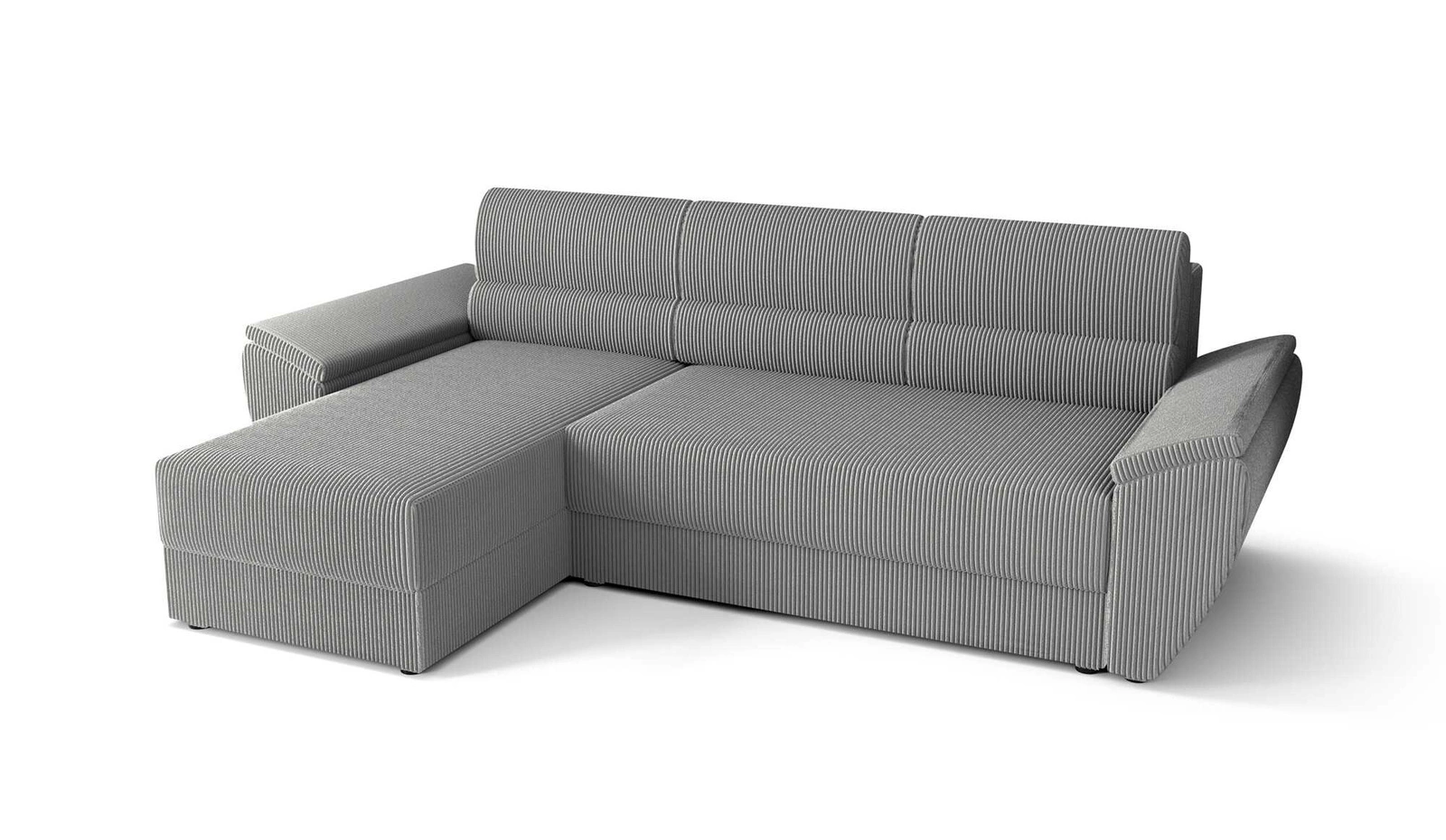 - Narożnik z funkcją spania Fogu II to stylowy mebel utrzymany w minimalistycznej formie. Mebel wyposażony w pojemnik na pościel oraz szerokie podłokietniki pokryty jest miękką i wytrzymałą sztruksową tkaniną o wyrazistych i grubych prążkach.