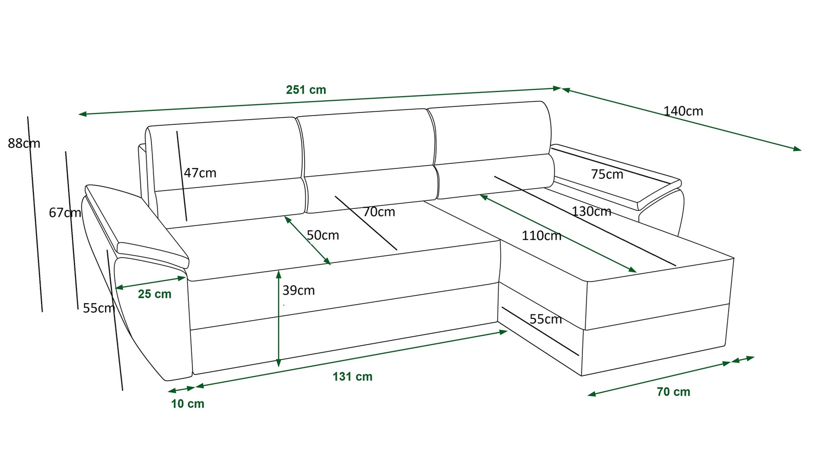 Dzięki swoim wymiarom oraz szerokiej funkcjonalności narożnik z funkcją spania świetnie sprawdzi się jako narożnik do pokoju dziennego lub jako narożnik rozkładany do pokoju gościnnego. Narożnik z funkcja spania to także świetna alternatywa łóżka w pokoju młodzieżowym. Szerokość narożnika 251 cm, wysokość 88 cm oraz głębokość 140 cm. Powierzchnia spania narożnika wynosi 130x200 cm. Wysokość siedziska mebla to 39 cm, a wysokość oparcia wynosi 47 cm. Pianka poliuretanowa T30 to materiał, z którego wykonane zostało siedzisko narożnika. Miękkie poduchy oparciowe zapewnią wysoki komfort podczas codziennego odpoczynku, który docenisz Ty a także goście, którzy zasiądą na tym wyjątkowym narożniku.