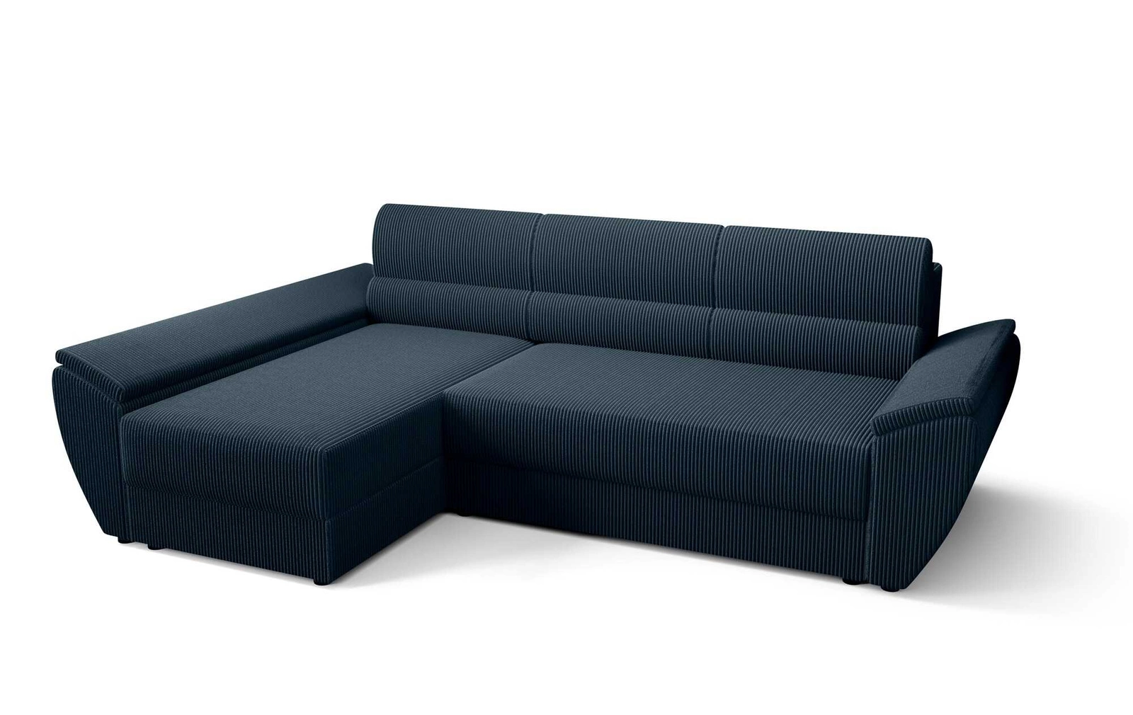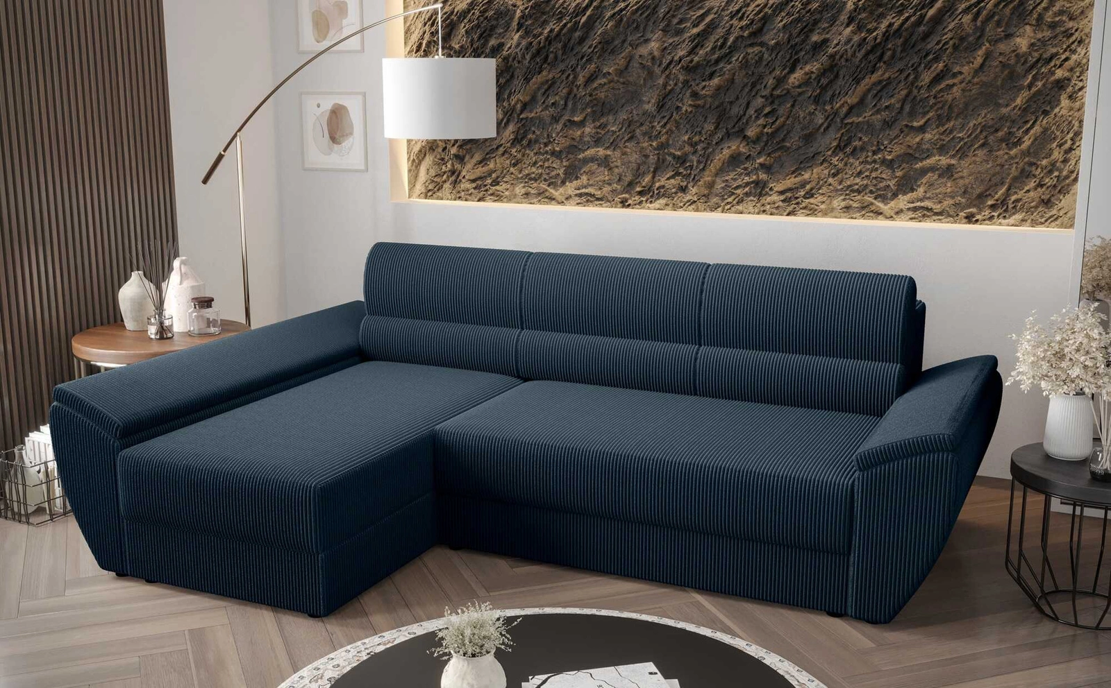 Narożnik z funkcją spania Fogu III niebieski lewostronny stylowy narożnik z podłokietnikami pojemnik na pościel sztruksowa tkanina