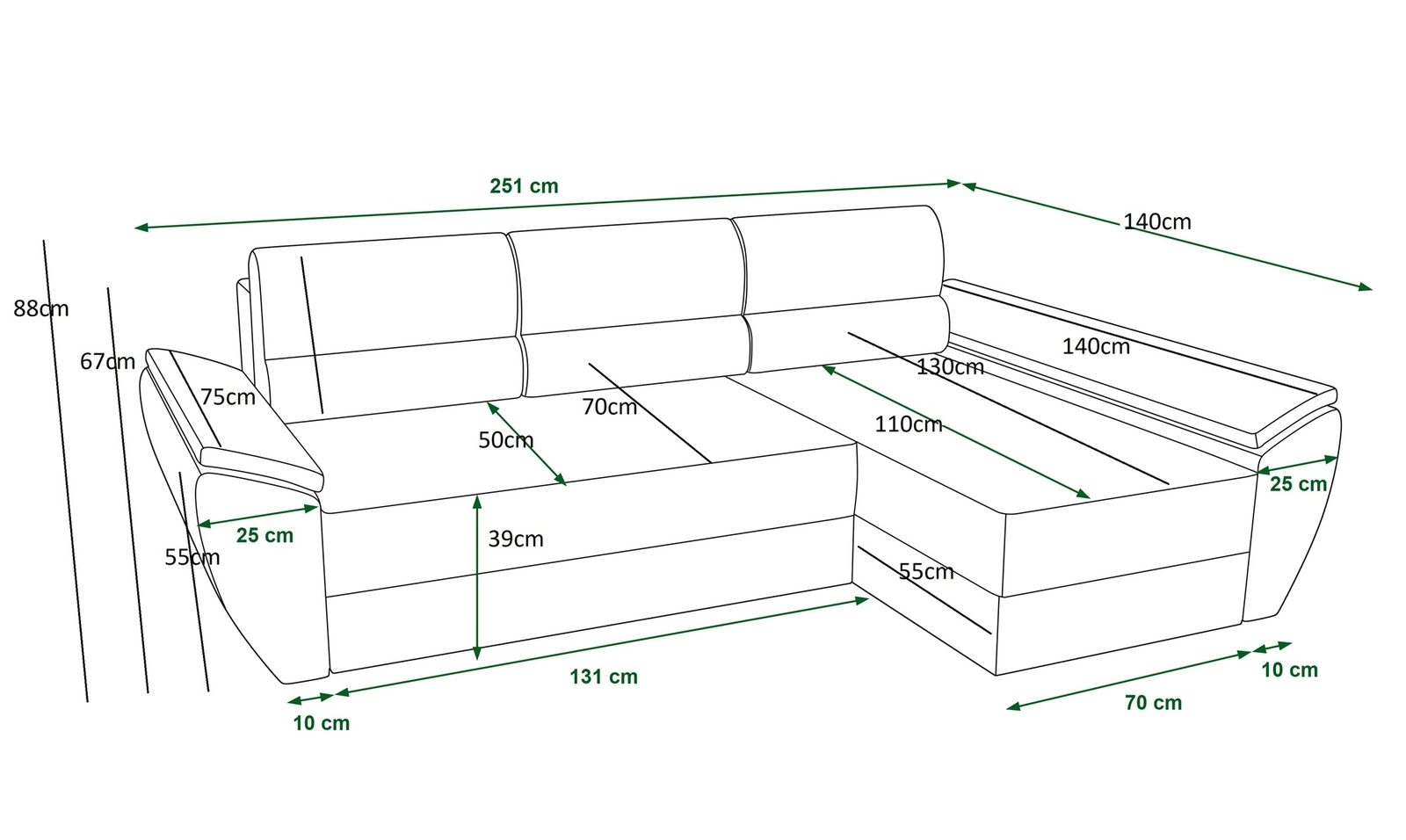 Dzięki swoim wymiarom oraz szerokiej funkcjonalności narożnik z funkcją spania świetnie sprawdzi się jako narożnik do pokoju dziennego lub jako narożnik rozkładany do pokoju gościnnego. Narożnik z funkcja spania to także świetna alternatywa łóżka w pokoju młodzieżowym. Szerokość narożnika 251 cm, wysokość 88 cm oraz głębokość 140 cm. Powierzchnia spania narożnika wynosi 130x200 cm. Wysokość siedziska mebla to 39 cm, a wysokość oparcia wynosi 47 cm. Pianka poliuretanowa T30 to materiał, z którego wykonane zostało siedzisko narożnika. Miękkie poduchy oparciowe zapewnią wysoki komfort podczas codziennego odpoczynku, który docenisz Ty a także goście, którzy zasiądą na tym wyjątkowym narożniku.
