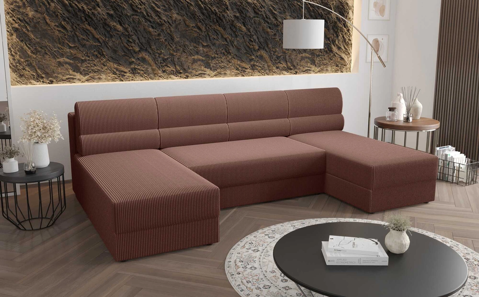 - Narożnik z funkcją spania Fogu U to nowoczesny i stylowy mebel utrzymany w minimalistycznej formie. Mebel wyposażony w pojemnik na pościel pokryty jest miękką i wytrzymałą sztruksową tkaniną o wyrazistych i grubych prążkach.