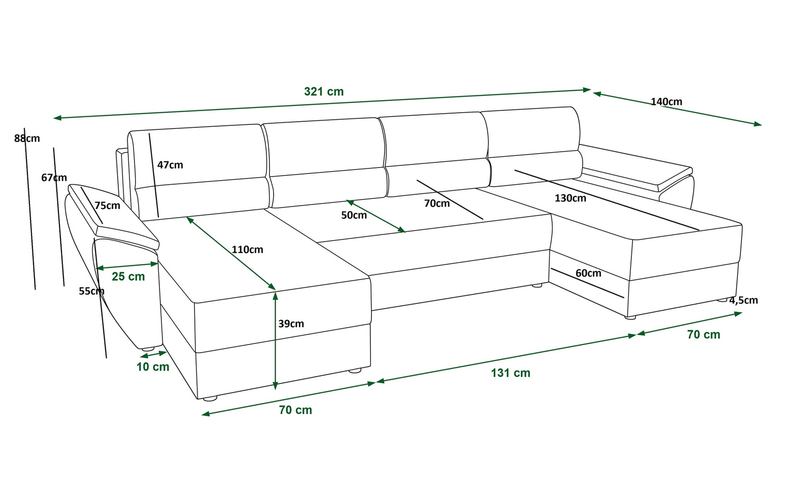 Dzięki swoim wymiarom oraz szerokiej funkcjonalności narożnik z funkcją spania świetnie sprawdzi się jako narożnik do pokoju dziennego lub jako narożnik rozkładany do pokoju gościnnego. Narożnik z funkcja spania to także świetna alternatywa łóżka w pokoju młodzieżowym. Szerokość narożnika 321 cm, wysokość 88 cm oraz głębokość 140 cm. Powierzchnia spania narożnika wynosi 130x270 cm. Wysokość siedziska mebla to 39 cm, a wysokość oparcia wynosi 47 cm. Pianka poliuretanowa T30 to materiał, z którego wykonane zostało siedzisko narożnika. Miękkie poduchy oparciowe zapewnią wysoki komfort podczas codziennego odpoczynku, który docenisz Ty a także goście, którzy zasiądą na tym wyjątkowym narożniku.