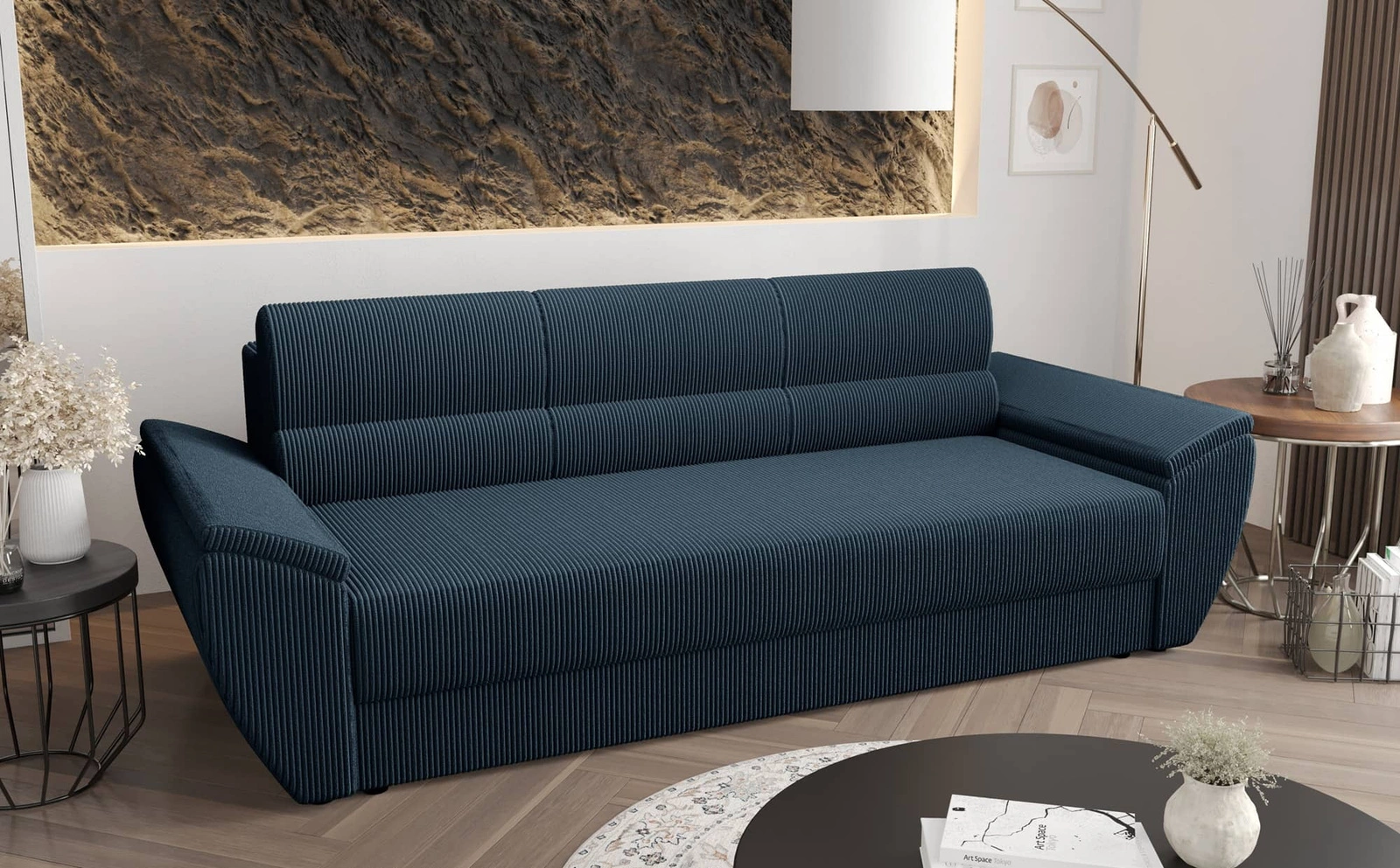 Kanapa rozkładana Fogu Bis niebieska stylowa sofa z komfortowymi podłokietnikami sztruksowa tkanina obiciowa pojemnik na pościel