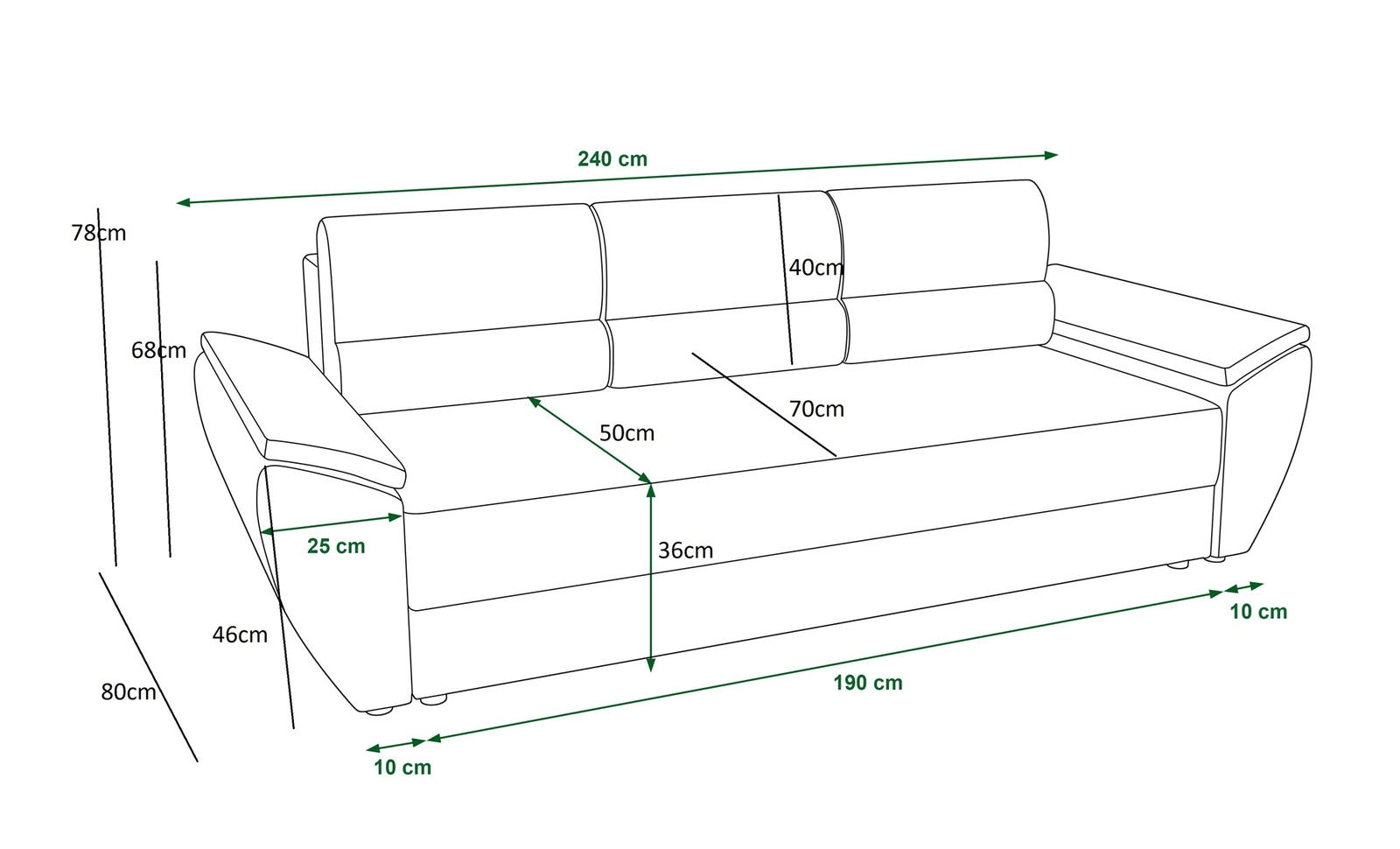 Rozłożenie pełnej powierzchni spania jest bardzo łatwe i nie wymaga użycia dużej siły. Siedzisko jest wysuwane na drewnianych płozach. Powierzchnia spania kanapy wynosi 130x190 cm. Mebel wyposażony został w niskie nóżki wykonane z tworzywa sztucznego. Gwarantuje komfortowe i bezproblemowe korzystanie oraz trwałość całego mebla przez wiele lat użytkowania. Idealnie sprawdzi się w roli kanapy do salonu, kanapy z funkcją spania oraz każdym wnętrzu urządzonym w Twoim ulubionym stylu.