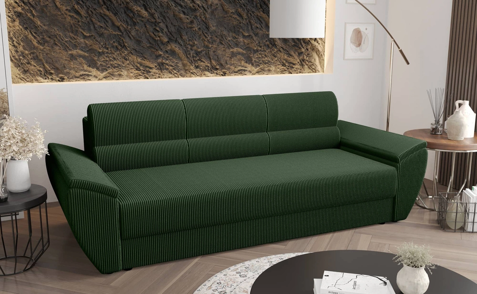 Kanapa rozkładana Fogu Bis zielona stylowa sofa z komfortowymi podłokietnikami sztruksowa tkanina obiciowa pojemnik na pościel
