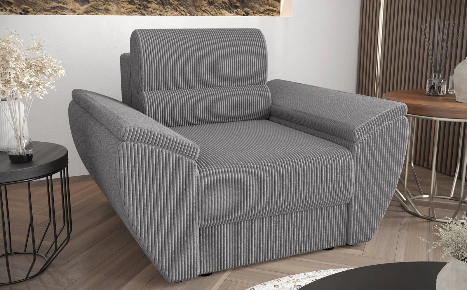 Fotel Fogu szary popiel nowoczesny design wygodny fotel do salonu sztruksowa tkanina o wyrazistych prążkach szerokie podłokietniki