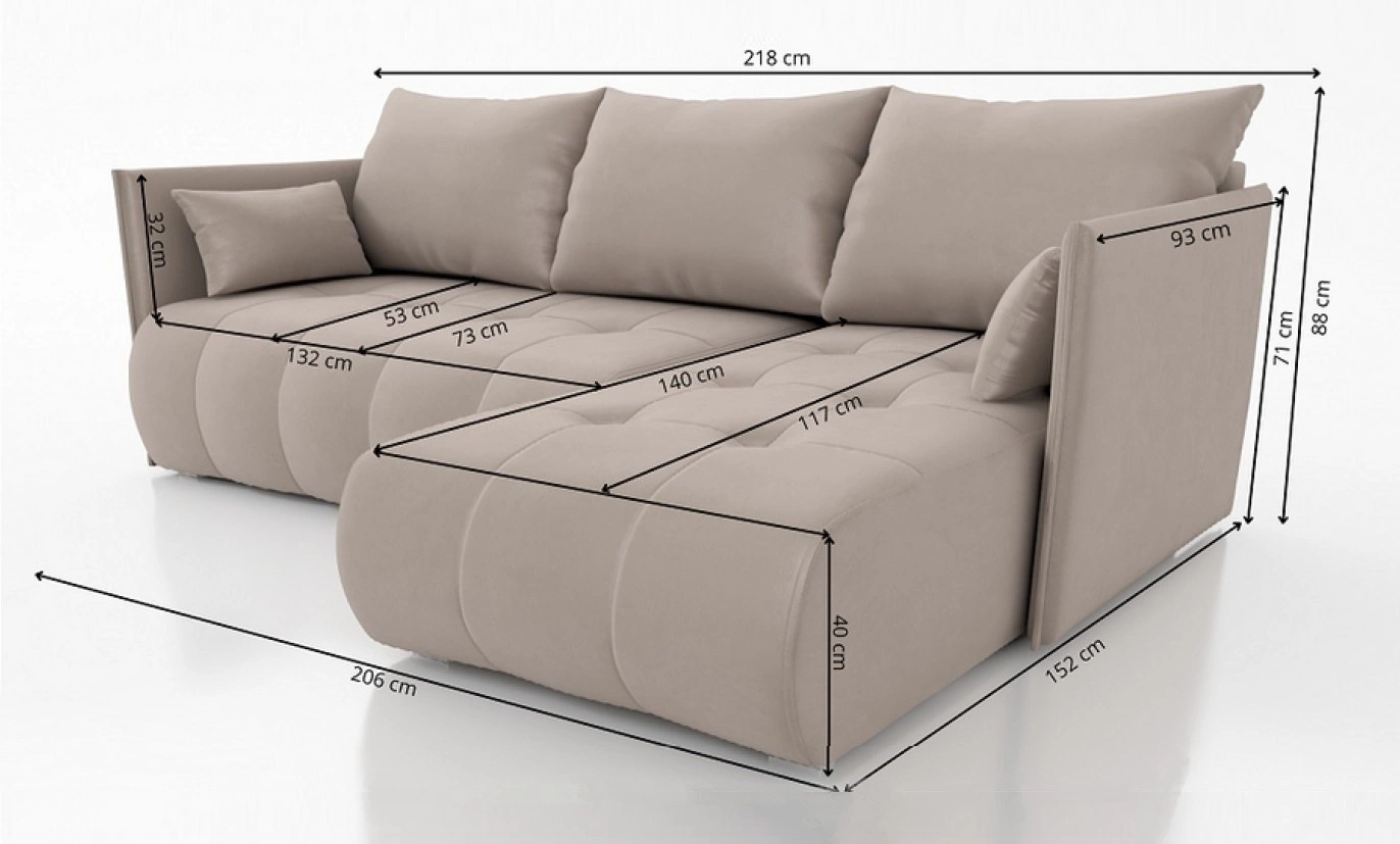 Dzięki swoim wymiarom oraz szerokiej funkcjonalności narożnik z funkcją spania świetnie sprawdzi się jako narożnik do pokoju dziennego lub jako narożnik rozkładany do pokoju gościnnego. Narożnik z funkcja spania to także świetna alternatywa łóżka w pokoju młodzieżowym. Szerokość narożnika 218 cm, wysokość 88 cm oraz głębokość 152 cm. Powierzchnia spania narożnika wynosi 140x206 cm. Wysokość siedziska mebla to 40 cm, a wysokość oparcia wynosi 48 cm. Sprężyny faliste oraz pianka poliuretanowa T28 to materiał, z którego wykonane zostało siedzisko narożnika. Miękkie poduchy oparciowe zapewnią wysoki komfort podczas codziennego odpoczynku, który docenisz Ty a także goście, którzy zasiądą na tym wyjątkowym narożniku.