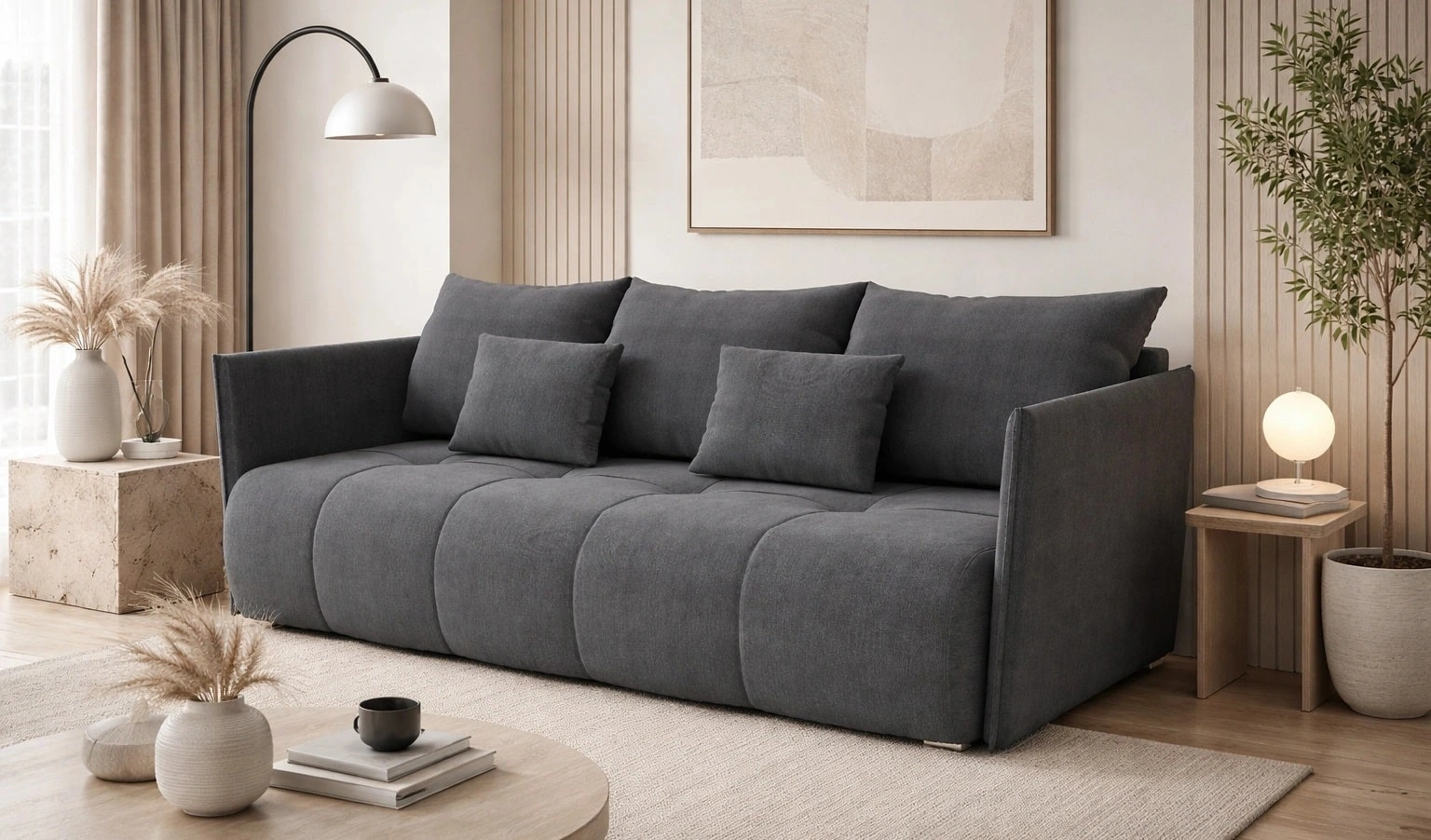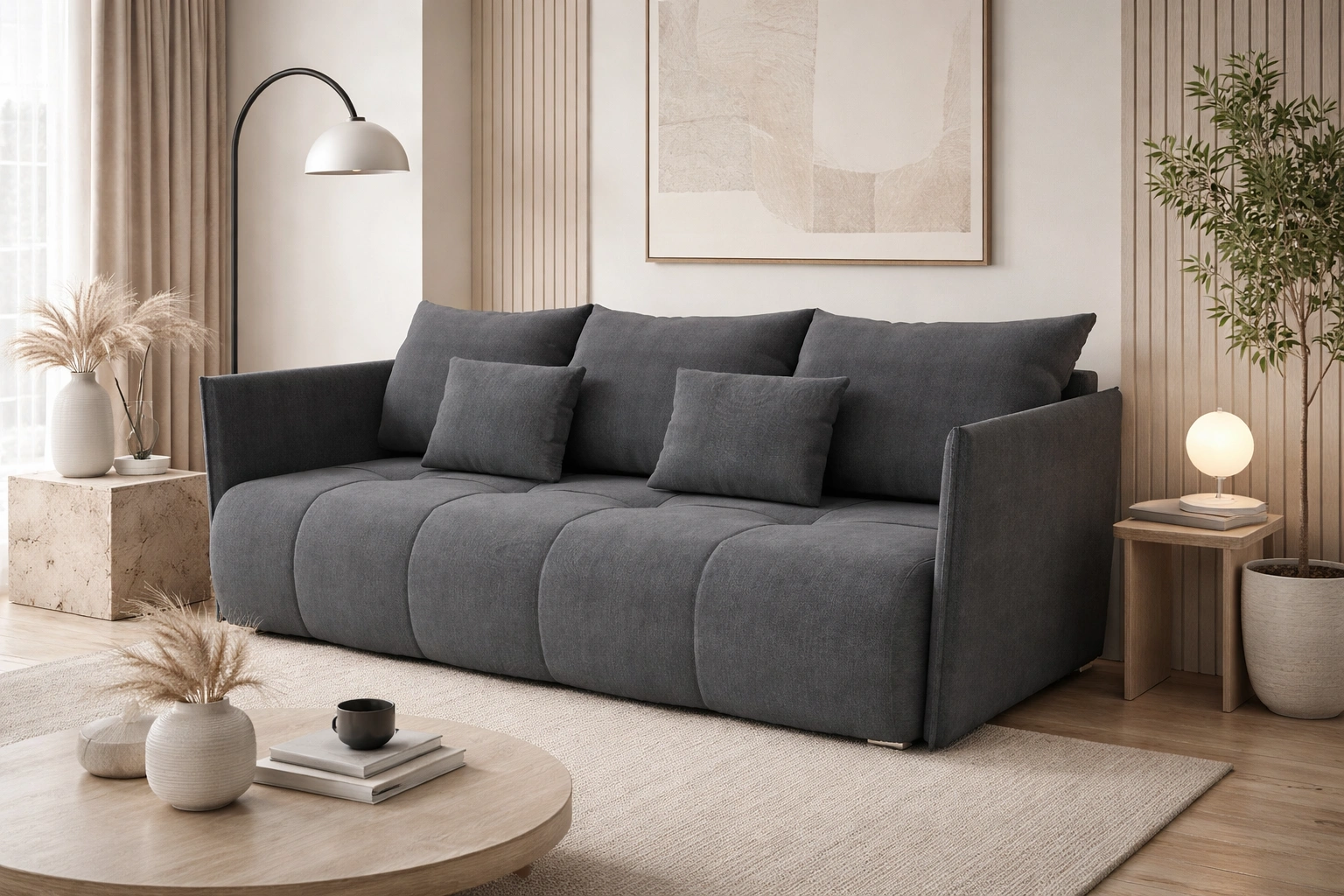 Kanapa rozkładana Selva w kolorze ciemny szary to atrakcyjny mebel, który z łatwością odnajdzie się w każdym pomieszczeniu Twojego domu.