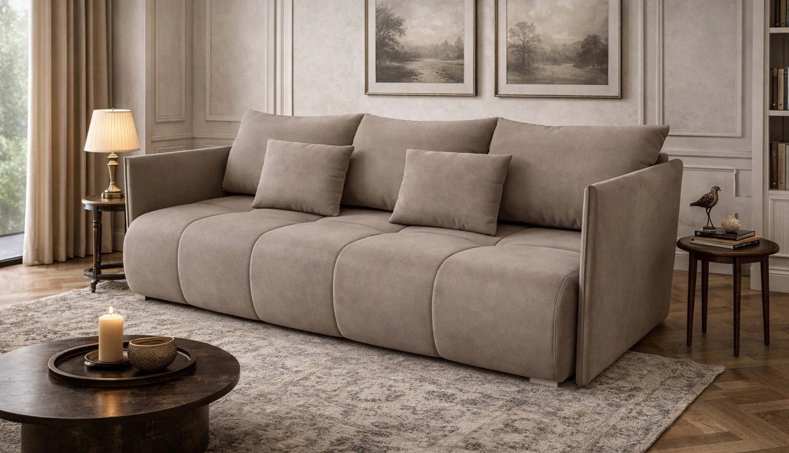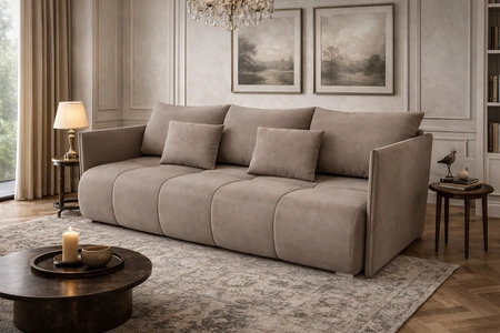 Kanapa rozkładana Selva ciemny beż funkcjonalna sofa do salonu z pojemnikiem na pościel wykonana z tkaniny o pluszowej powierzchni
