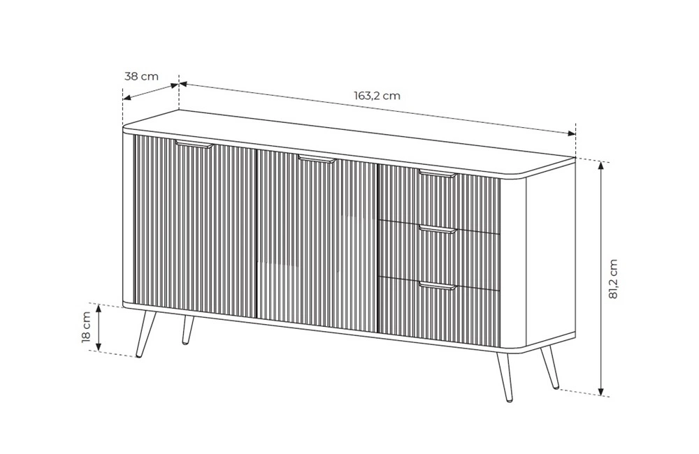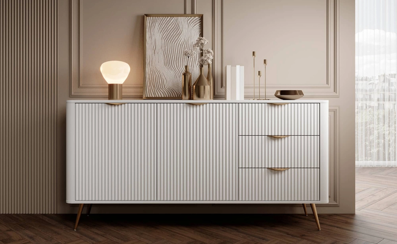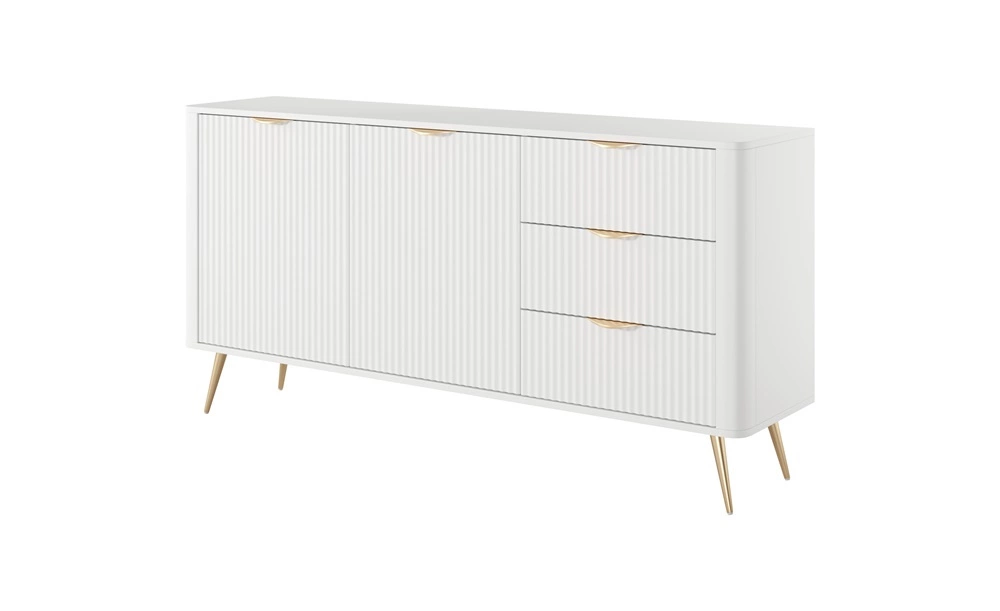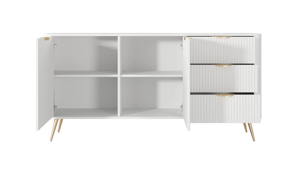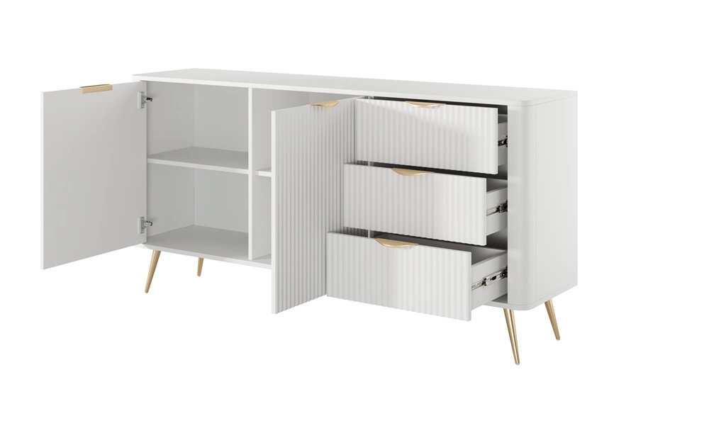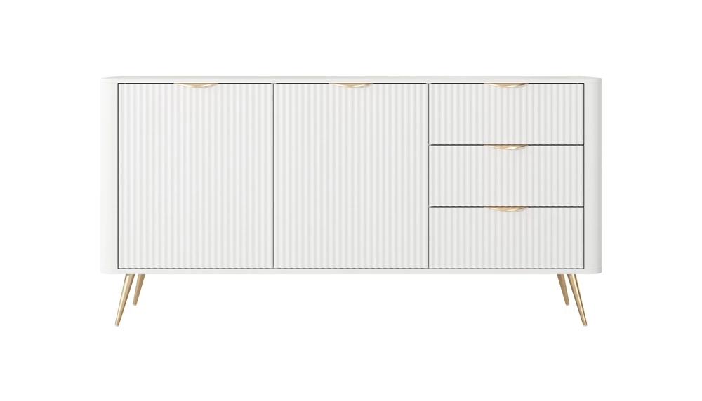 Ryflowane fronty zostały wykonane z płyty MDF. Korpus komody wykonany jest z wysokiej jakości płyty laminowanej o grubości 16mm, która charakteryzuje się odpornością na wpływ czynników zewnętrznych takich jak obicia, uderzenia i niefortunne zadrapania. Konstrukcję mebla urozmaicono złotymi metalowymi nogami. Precyzyjne wykończenie i dbałość o detale sprawiają, że komoda zachowa swój piękny wygląd na wiele lat, nie tracąc przy tym na funkcjonalności.