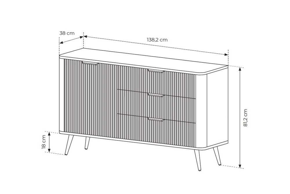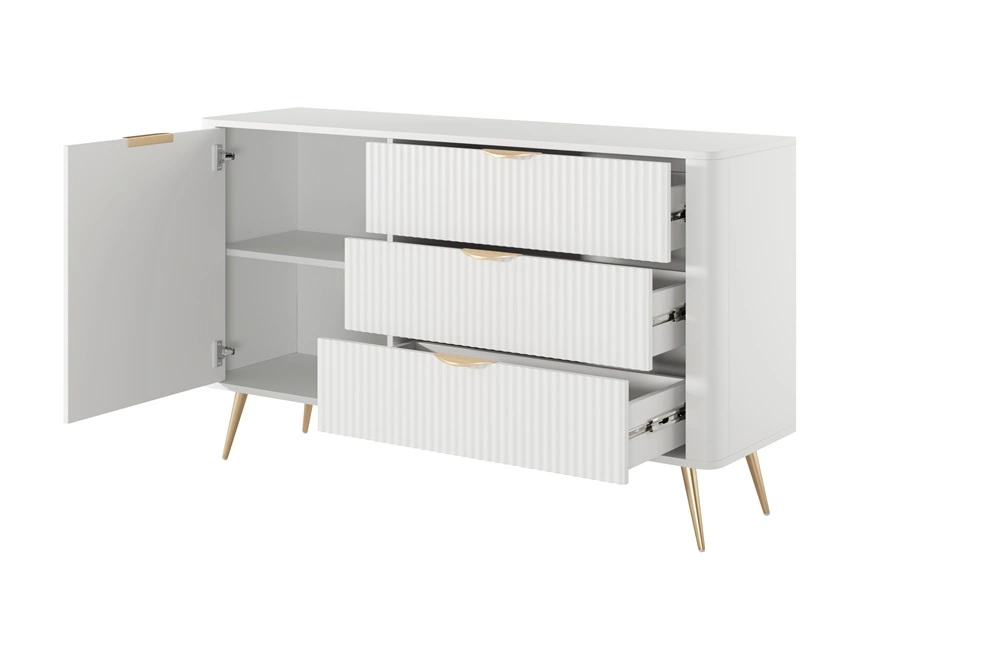 Ryflowane fronty zostały wykonane z płyty MDF. Korpus komody wykonany jest z wysokiej jakości płyty laminowanej o grubości 16mm, która charakteryzuje się odpornością na wpływ czynników zewnętrznych takich jak obicia, uderzenia i niefortunne zadrapania. Konstrukcję mebla urozmaicono złotymi metalowymi nogami. Precyzyjne wykończenie i dbałość o detale sprawiają, że komoda zachowa swój piękny wygląd na wiele lat, nie tracąc przy tym na funkcjonalności.