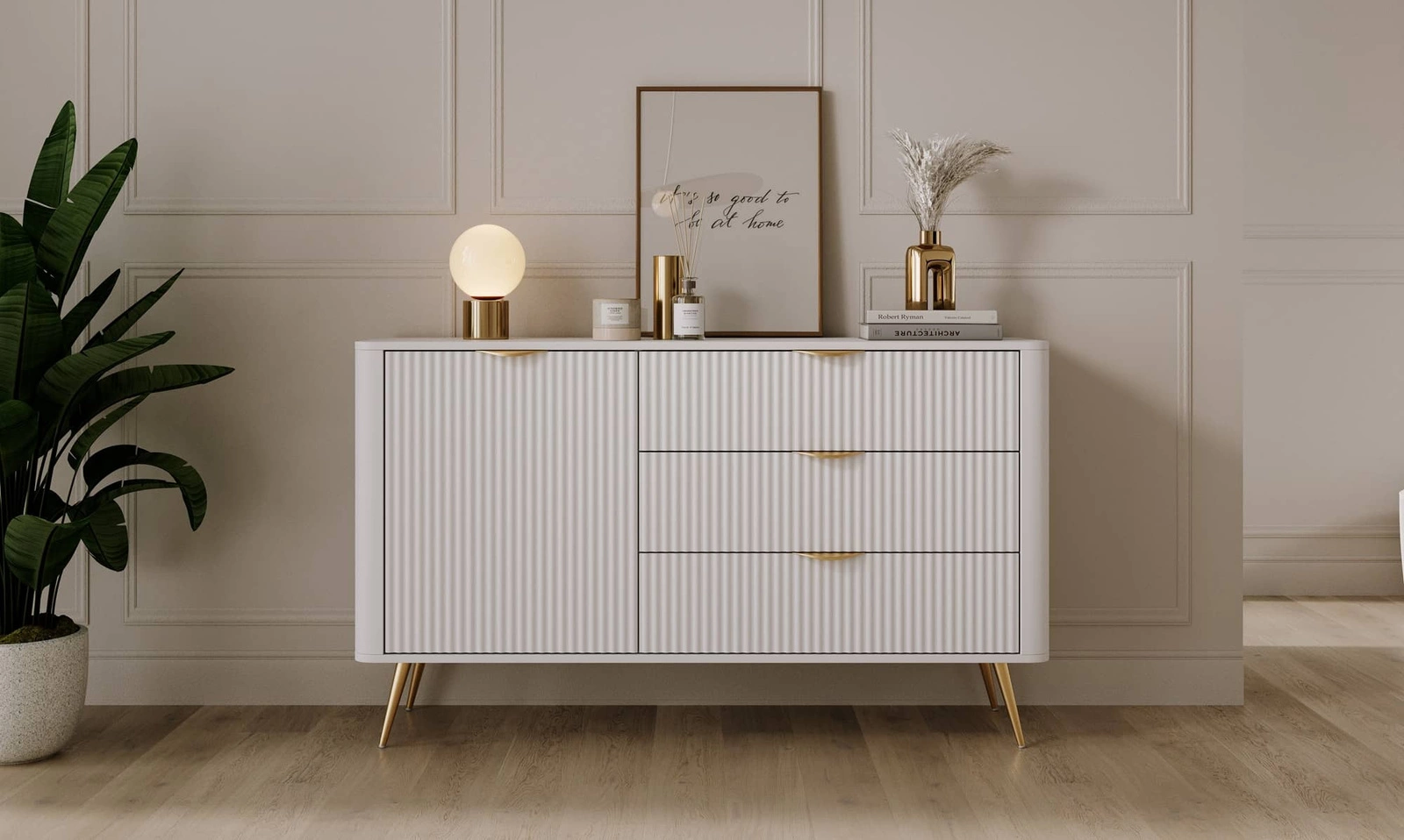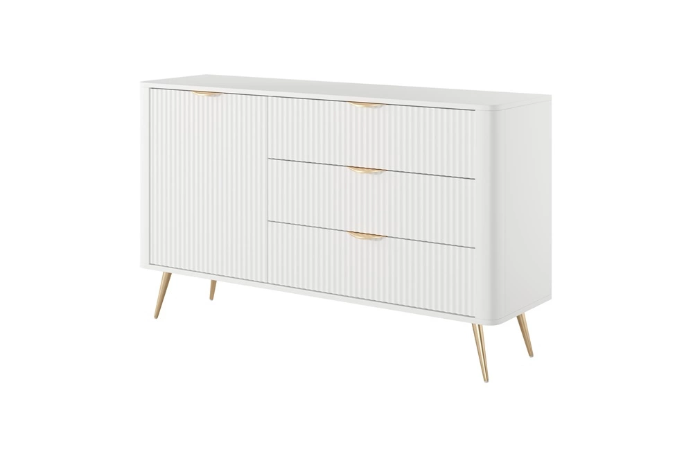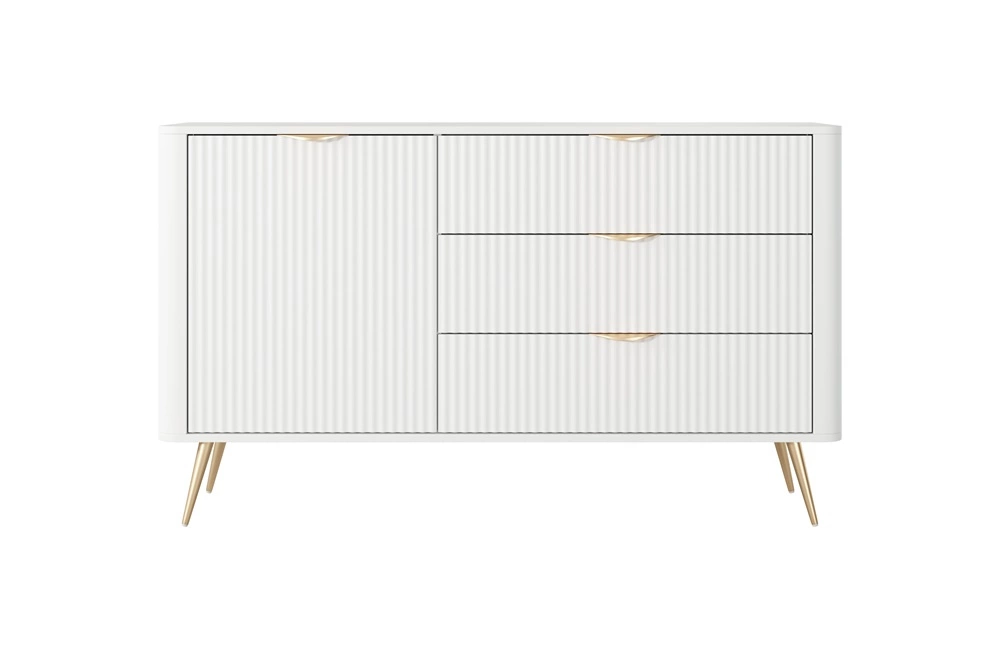 Komoda z szufladami 138 cm Lante w kolorze białym to nowoczesny mebel, który zaskakuje swoim kształtem oraz estetyką.