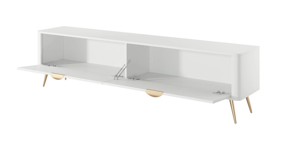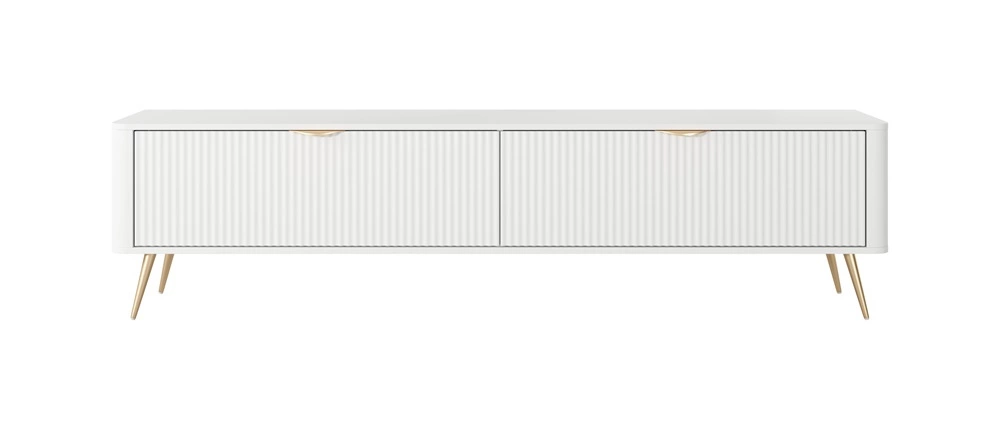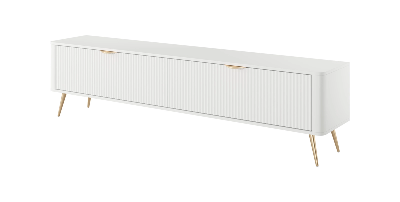 Szafka RTV Lante 200 cm biała nowoczesny design bryła osadzona na wysokich nogach ryflowany front charakterystyczny owalny kształt