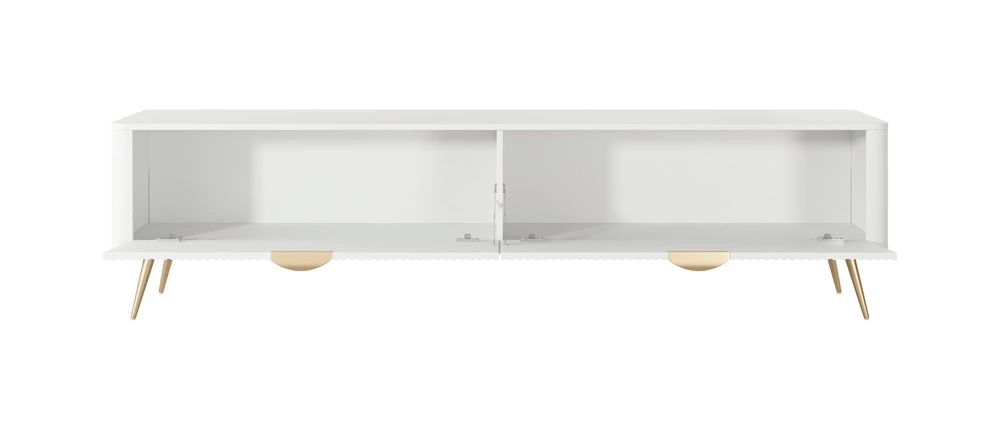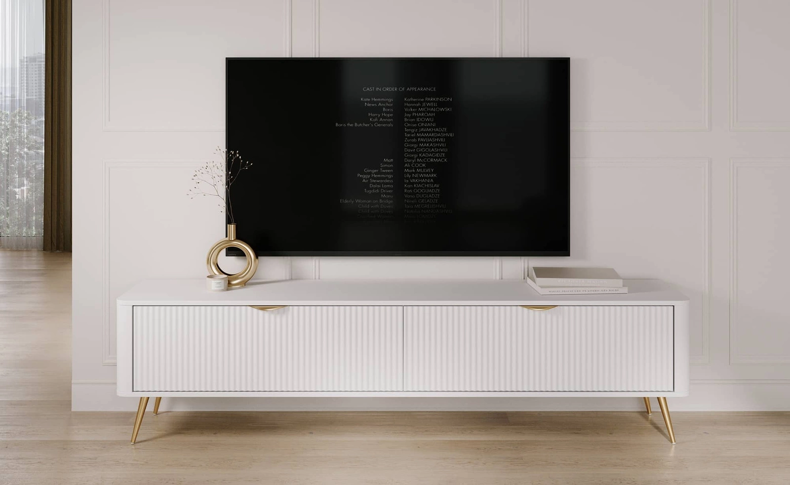 Ryflowane fronty zostały wykonane z płyty MDF. Korpus szafki RTV wykonany jest z wysokiej jakości płyty laminowanej o grubości 16mm, która charakteryzuje się odpornością na wpływ czynników zewnętrznych takich jak obicia, uderzenia i niefortunne zadrapania. Konstrukcję mebla urozmaicono złotymi metalowymi nogami. Precyzyjne wykończenie i dbałość o detale sprawiają, że szafka pod telewizor zachowa swój piękny wygląd na wiele lat, nie tracąc przy tym na funkcjonalności.